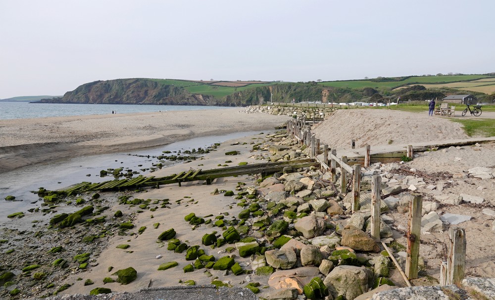 Ciel un peu gris ce matin, mais nous partons tout de même dès 8h à vélo car la pluie est annoncée pour midi. Nous pédalons jusqu’à Pentewan, un tout petit village situé au nord de Mevagissey. En réalité, c’est surtout la plage de sable qui attire les touristes – il y a un grand camping juste en bord de mer – car d’emblée, nous sommes un peu déçus par les environs qui semblent à l’abandon.