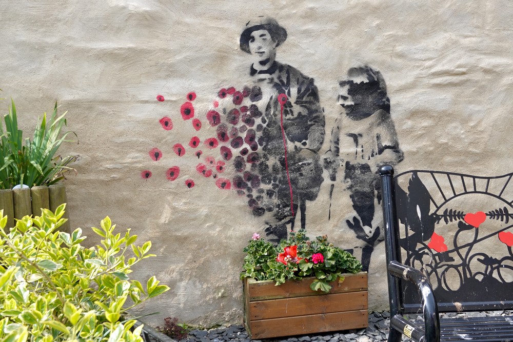 Nous avions prévu une randonnée à pied sur le sentier côtier – en direction du nord – mais finalement, nous changeons nos plans car les lieux ne nous inspirent pas vraiment. Du coup, nous reprenons les vélos, et attaquons la remontée – puis évidement la descente – jusqu’à Mevagissey. Il est encore tôt, le village semble endormi et nous arpentons tranquillement les étroites ruelles. On repère même une peinture qui pourrait être signée par Banksy !