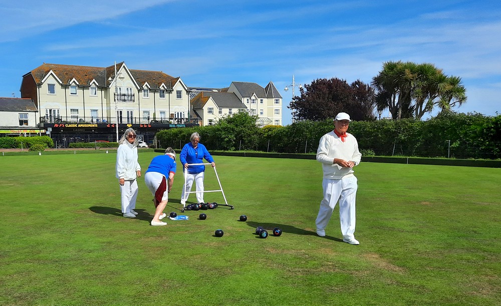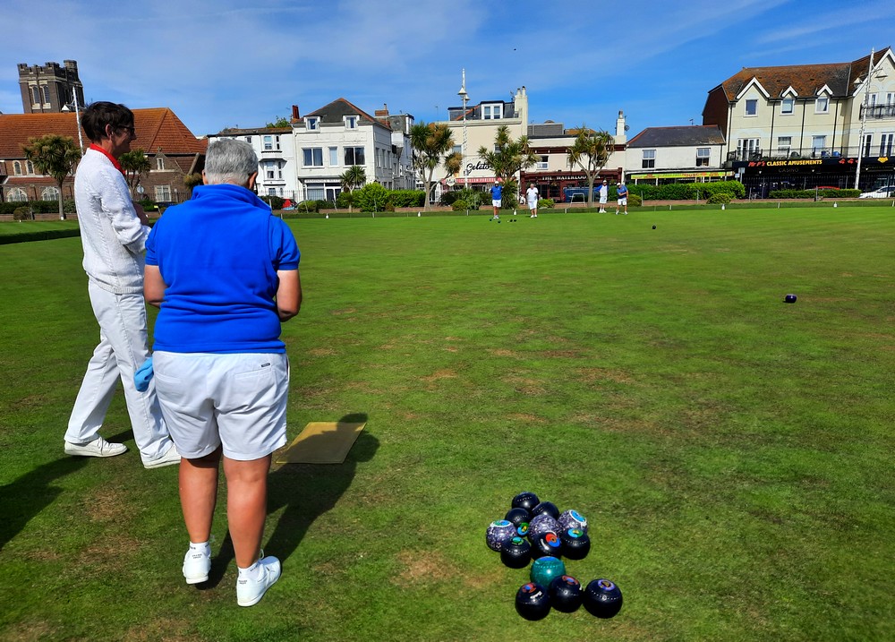 Grosse pluie toute la matinée… Vers 13h, on profite d’une accalmie pour aller sur le front de mer de Bognor Regis, distant d’environ 3km. Mais les fortes rafales de vent nous dissuadent de toute flânerie, et on préfère tester le mini-golf tout proche mais bien abrité. Après un parcours sans grande surprise mais bien conçu – qu’en toute modestie, je gagne de deux points – nous observons un moment les joueurs de lawn bowling – boulingrin en français – sur le terrain tout proche. Cette sorte de pétanque anglaise, dont les origines remontent au Moyen-Age, se joue sur gazon, avec de grosses boules non sphériques dont la forme particulière permet des trajectoires elliptiques. Surprenant !