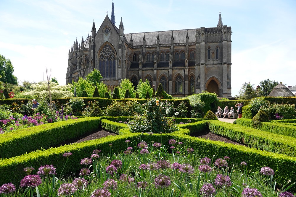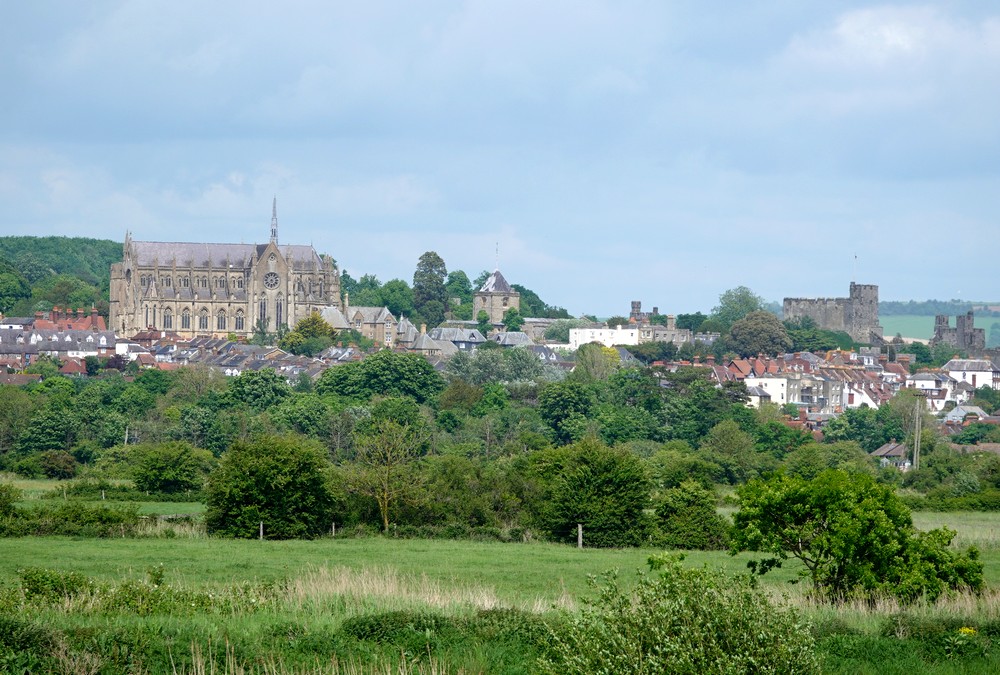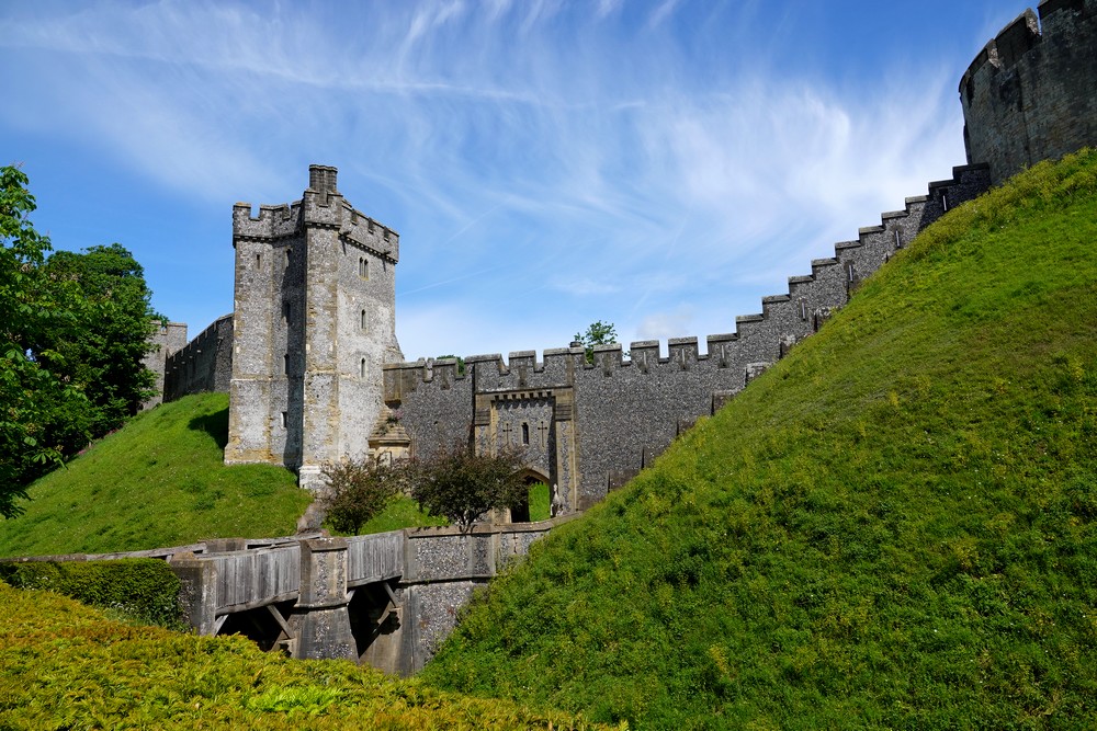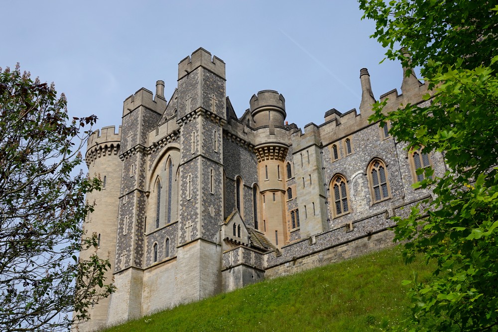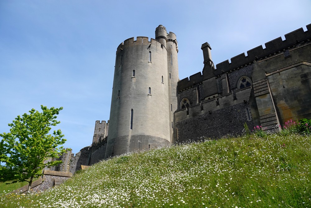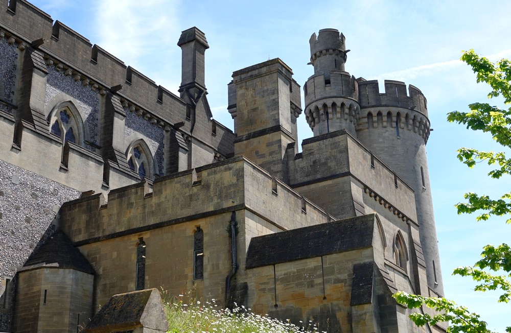 Grand soleil au réveil ! Dès 8h, on est sur les vélos et on pédale en direction d’Arundel en suivant en partie une voie cyclable. Objectif de la journée : la découverte du gigantesque château d’Arundel et ses jardins, demeure du 18e Duc de Norfolk qui y habite encore parfois avec sa famille. Au départ, nous hésitions à faire cette visite – encore un château ! – mais finalement, sur les conseils d’un ami de ma fille qui connait bien la région, nous nous sommes laissés tenter. Excellente idée, car dès l’arrivée dans le village, dominé par l’énorme forteresse, nous sommes immédiatement conquis par l’ambiance médiévale des lieux !