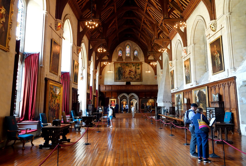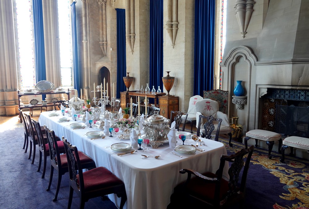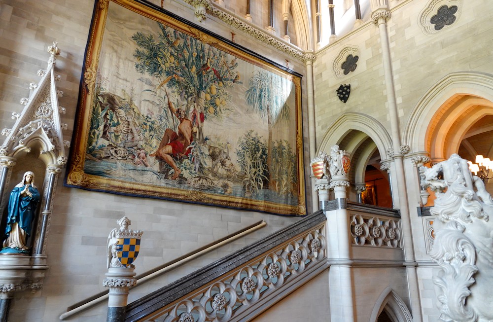 Après plus de deux heures passés dans cette belle ambiance fleurie, nous retournons vers le château pour visiter les intérieurs. Nous suivons un itinéraire balisé qui nous fait d’abord découvrir la chapelle privée et la grande salle du baron, longue de 41m. Après sa rénovation de 1900, le château d’Arundel fut l’un des premiers du pays à être équipé de l’éclairage électrique, de détecteurs anti-incendie intégrés, d’alimentation en eau courante, d‘ascenseurs et même du chauffage central. Pour l’anecdote, il faut savoir que l’installation électrique, à l’époque, nécessita de débourser plus de 36.000£, tandis que la cheminée magnifiquement sculptée du salon ne coûta que 150£ !