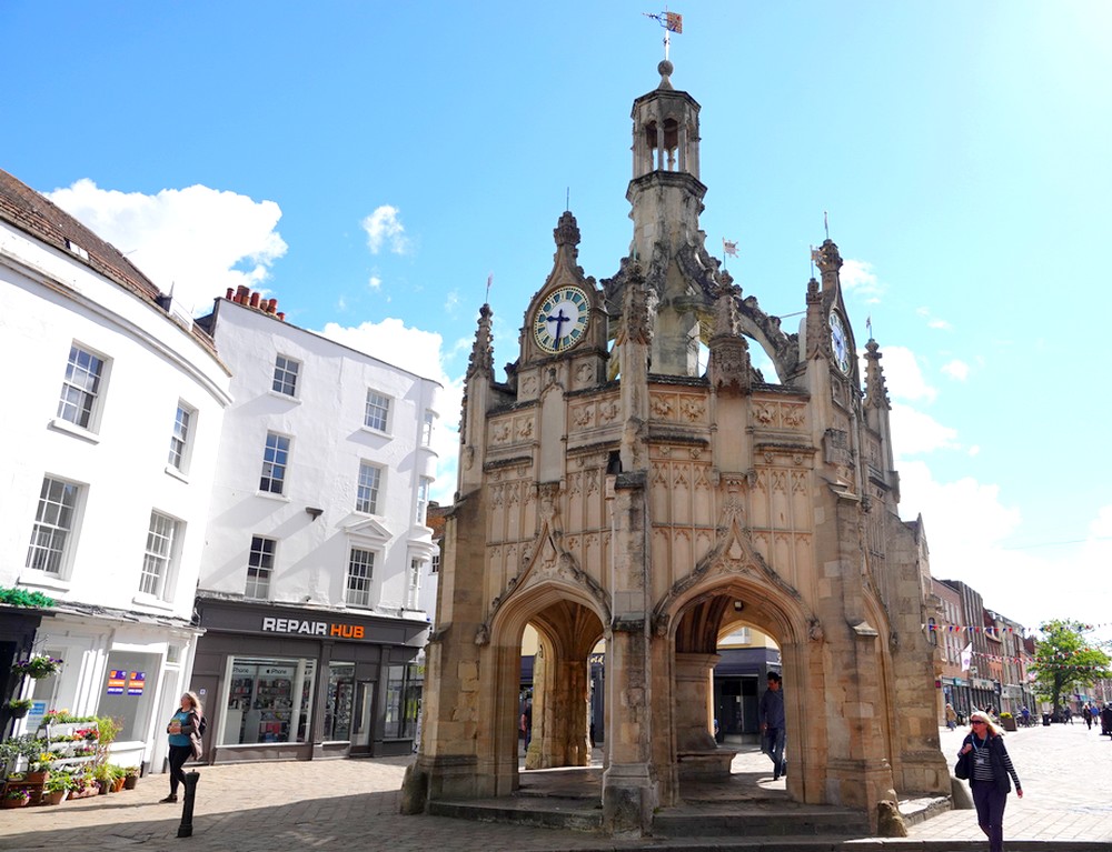 Comme il fait un peu meilleur, dès 8h30 nous partons à vélo à Chichester, chef-lieu du West Sussex. Le parcours se fait presque intégralement sur piste cyclable, ce qui est suffisamment rare pour être souligné ! Le fléchage est relativement correct, et à l’exception d’une ou deux hésitations, nous parvenons à bon port. Fondée par les Romains, la ville a connu son apogée au XVIIIe siècle et presque toute son architecture date de cette époque. Nous nous garons à quelques mètres de Market Cross, la Croix du Marché, édifiée entre 1477 et 1503.