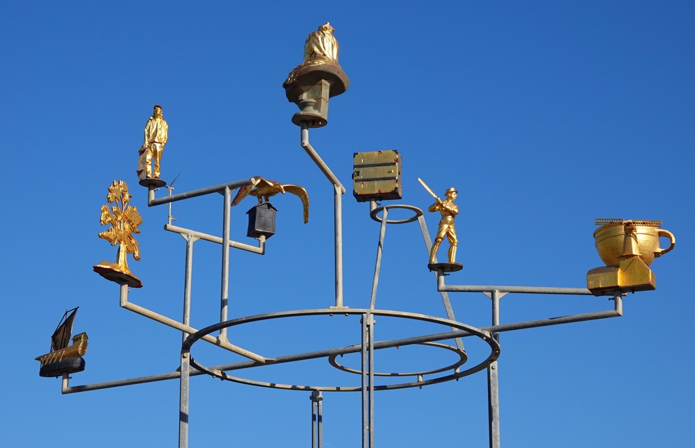Après un trajet sans histoire – nous sommes seuls avec nos vélos dans le wagon ! – nous débarquons dans la plus célèbre des stations balnéaires anglaises vers 7h15. Nous filons immédiatement vers le front de mer qui, pour l’heure, n’est fréquenté que par les joggeurs et promeneurs de chiens. Nous pédalons jusqu’à Hove sur une belle piste cyclable, la plus large que nous arpentons en trois mois de voyage ! C’est ici que sont installées les belles beach huts – autrement dit cabanes de plage – de la région qui, depuis presque 100 ans, font fureur auprès des amateurs. Mais attention, pour en posséder une, il faut débourser entre 25.000£ et 40.000£, somme rondelette à laquelle on doit ajouter un loyer de 416£ annuel ! Non loin, la sculpture Constellation créée par Jonathan Wright surprend, avec ses icones dorées représentant le passé et le futur de la ville…