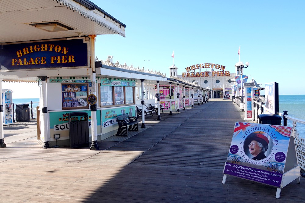 Un peu plus loin, autre symbole de la ville, le Brighton Palace Pier est encore bien calme à cette heure matinale… Édifiée en 1899, la jetée a d’abord abrité un théâtre où Stan Laurel et Charlie Chaplin ont débuté leur carrière, avant de connaitre le succès aux États-Unis. Depuis 1984, c’est désormais un casino et une petite fête foraine qui attirent chaque jour – et encore plus le week-end – des centaines de visiteurs…