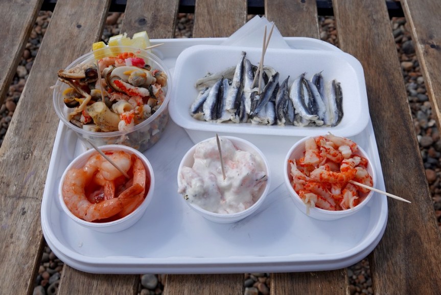 Il est maintenant temps pour nous de déjeuner ! Nous optons pour une dégustation de différents produits de la mer – anchois, crevettes, cocktail de fruits de mer, bulots – proposés par la poissonnerie Sea Haze, installée juste en bord de plage. Le cadre est splendide, et le repas excellent !