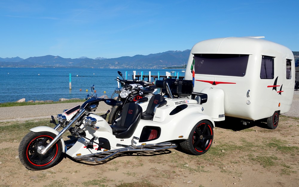 Nous dépassons Bardolino sans trop nous attarder – au passage, nous croisons un curieux équipage composé d’une sorte de moto à trois roues et d’une caravane – et parvenons enfin à Garda, vers 10h30. Encore quelques coups de pédale, et nous nous posons sur un banc avec vue sur le Parco San Vigilio, mais nous n’irons pas plus loin car désormais, il n’y a plus de piste, juste les galets de la plage, ce qui n’est pas idéal pour se déplacer à vélo !