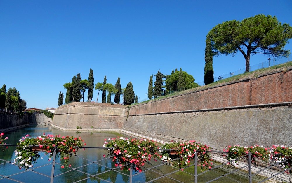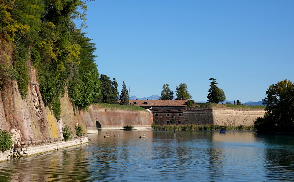 La configuration de cette petite ville est assez originale, car son centre est situé à l’intérieur d’une ancienne forteresse autrichienne, où la rivière Mincio – le principal déversoir du lac – commence à couler par quatre bras qui forment des canaux qui traversent la vieille ville. Peschiera est donc encerclée par d’énormes systèmes défensifs vénitiens, construits au XVIe siècle, et désormais classés au patrimoine mondial de l’UNESCO.