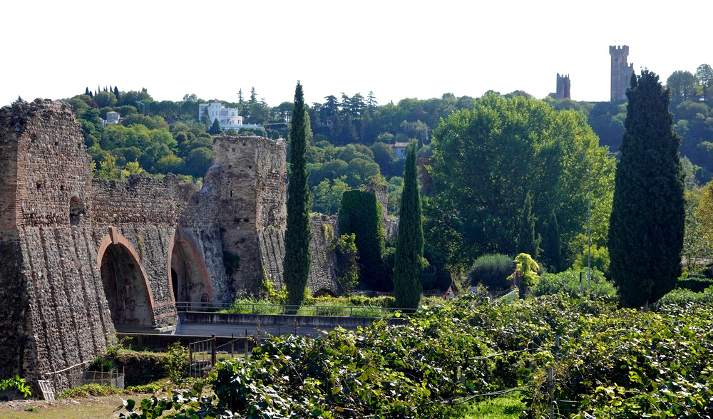 Ne trouvant pas d’endroit où parquer notre vélo à proximité des murs de la ville – on a raté les grands parkings situés à quelques centaines de mètres de là – c’est en pédalant que nous passons la porte d’entrée attenante au château – encore une réalisation de que l’on doit à la famille Scaligeri !