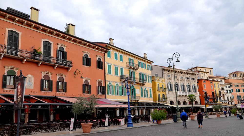 Comme nous sommes réveillés depuis 6h, inutile de flemmarder et dès 7h15, nous partons à pied du camping vers la gare de Peschiera. Là, nous patientons un moment puis vers 7h55, nous embarquons à bord d’un train qui, quinze minutes plus tard, nous dépose à Vérone. La gare étant assez excentrée du quartier historique, il nous faut une petite demi-heure pour rejoindre la Piazza Bra qui jouxte les célèbres arènes construites au Ier siècle après JC. Nous zappons la visite, préférant revenir un jour pour assister à une représentation d’Aïda !