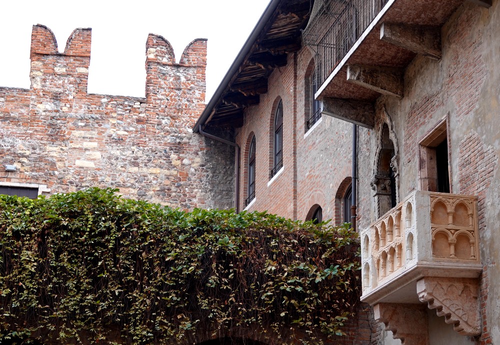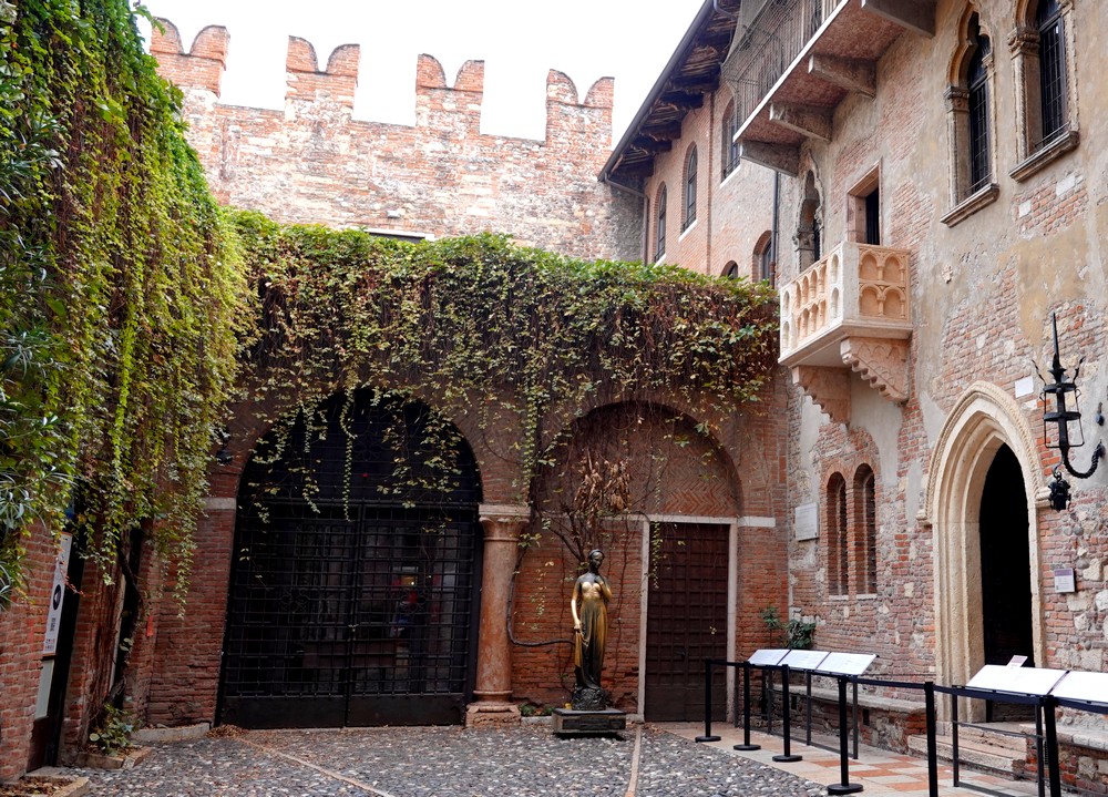 Nous poursuivons donc notre chemin en empruntant la via Mazzini, bordée de boutiques de luxe, toutes encore fermées à cette heure matinale. Nous débouchons rapidement via Cappello, à quelques pas de la célèbre Casa di Giulietta. Célébrant la tragédie Roméo et Juliette de William Shakespeare, parue en 1597, dont l’action se situe à Vérone, les visiteurs se pressent devant cette maison censée être celle qui, autrefois, abritait les amours contrariées des deux tourtereaux. En fait, si la bâtisse est ancienne – elle date du XIIe siècle – et vaut le coup d’œil, elle n’a jamais accueilli Roméo et Juliette, des personnages de pure fiction ! D’ailleurs, Shakespeare lui-même n’a jamais mis les pieds à Vérone… Mais profitant de l’engouement du public pour cette histoire si romantique, un historien a eu l’idée, à la fin des années 1930, de rajouter un balcon. Un beau coup de pub pour la ville, ainsi que pour le musée qui, depuis, engrange les deniers de ceux qui souhaitent prendre la pose sur le balcon ! Sous celui-ci, la statue en bronze de Juliette attire les amateurs de traditions superstitieuses : en effet, lui toucher le sein droit apporterait amour éternel et fertilité aux femmes, et belle rencontre aux célibataires…