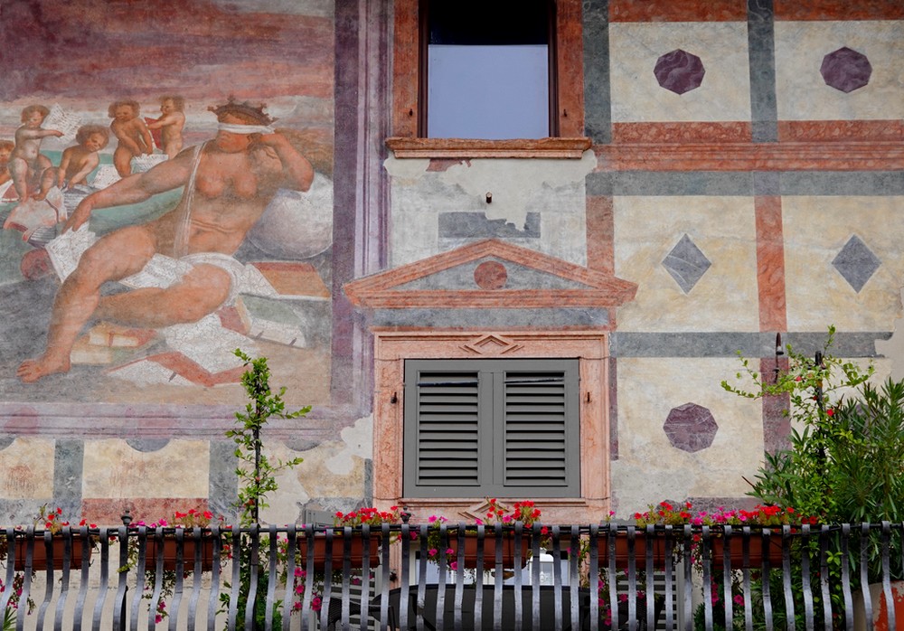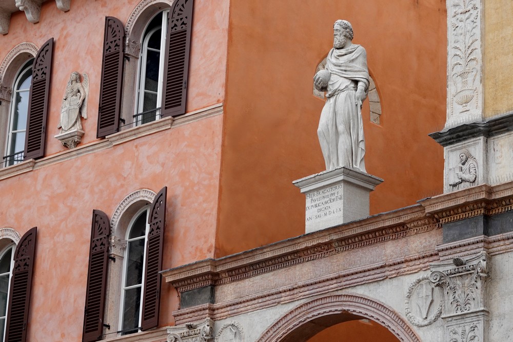 Nous continuons notre balade vers la Piazza delle Erbe, la plus ancienne place de Vérone, fondée sur l’ancien forum romain. Même sous un ciel oscillant désespérément entre le gris et le blanc, le site est superbe, avec ses palais baroques et ses anciennes maisons dont certaines sont encore ornées de fresques peintes. Dommage que la colonne Visconti soit empaquetée pour cause de rénovation, et que le centre de la place soit occupé par un marché touristique qui bouche un peu la perspective…