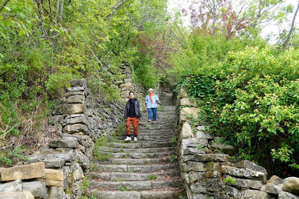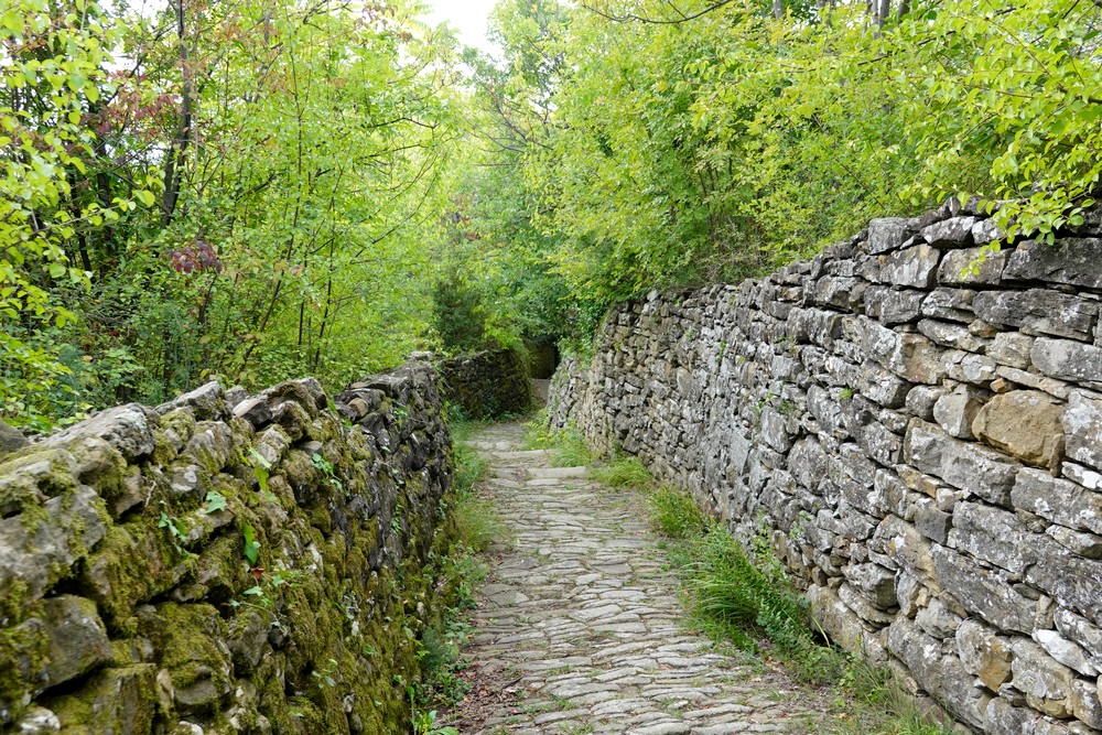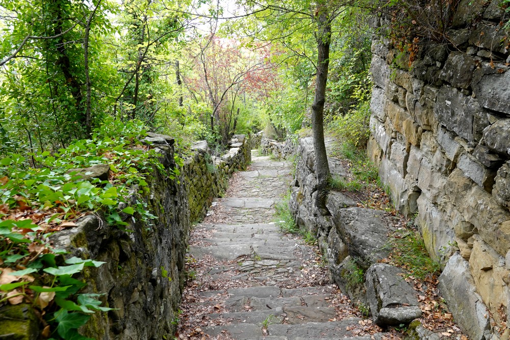 Pour cette balade qui part à gauche dès la sortie du camping, on emprunte d’abord l’itinéraire qui va à Stella de Trebiciano. A partir de ce point, on continue sur le GR 1, fléchage rouge / blanc parfois un peu discret, donc des hésitations possibles. Le cheminement est agréable, à l’ombre mais cette seconde partie offre finalement assez peu de vues sur la mer. La descente se fait par un sentier très caillouteux, au niveau de l’autoroute (ne pas passer sous le tunnel). Nous avions prévu de rejoindre San Giovanni, mais nous avons dû rater un embranchement car nous sommes arrivés à Longera ! Pas grave, de ce petit quartier on rejoint facilement le centre de Trieste en bus. Balade de 9km, +110m, -330m.