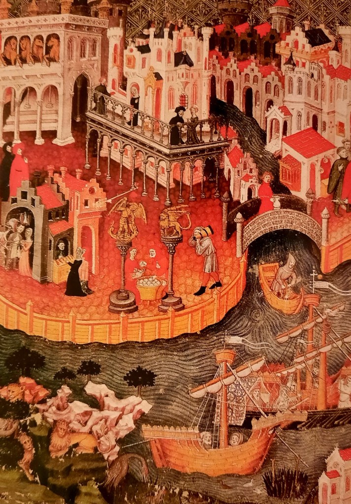 Comme il nous a déjà fallu une bonne journée pour découvrir les trésors de la Place Saint Marc, c’est de bonne heure le lendemain que nous partons arpenter ce quartier dense, aux ruelles étroites et aux multiples canaux. Même avec le plan fourni par le guide d’Hugo Pratt, on peine un peu à trouver notre chemin ! La balade du jour commence donc devant l’église San Zaccaria, datant du XVe siècle et affichant un mélange de styles gothique et Renaissance typiques à Venise. L’itinéraire nous fait traverser de minuscules cours et c’est un peu un jeu de piste que de débusquer puits – la passion de Gérard, il les prend tous en photos ! – patères et autres décorations de murs, comme ce dragon aperçu Corte del Rosario !