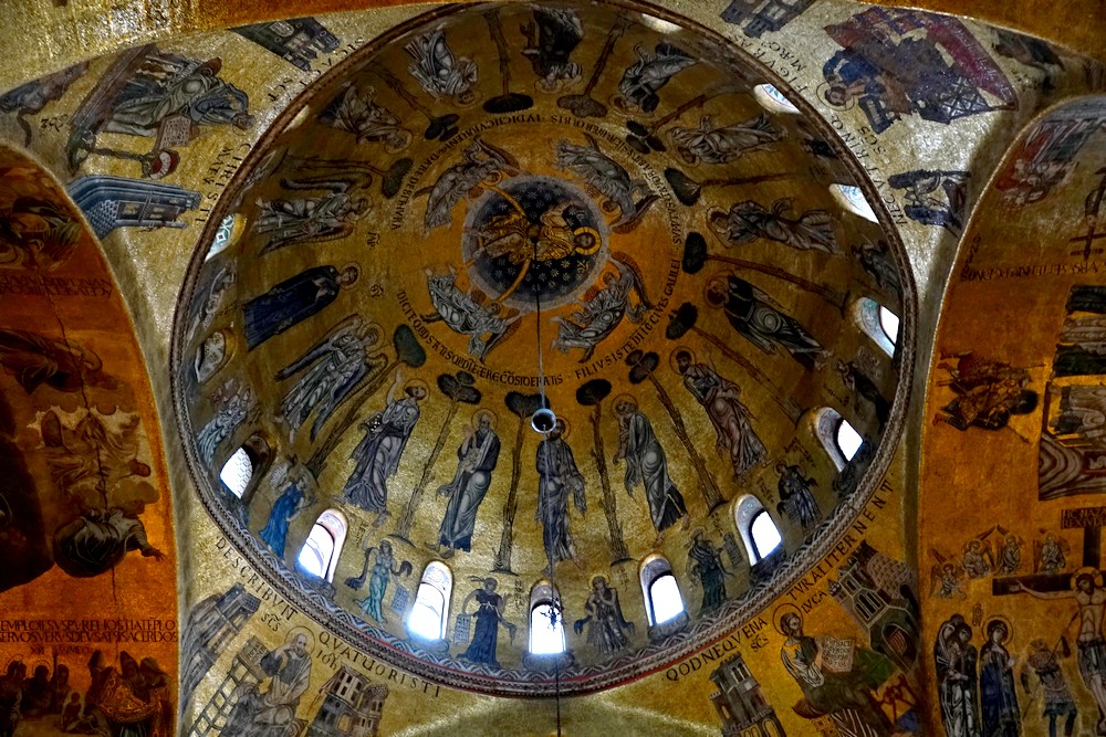 A 9h30, nous sommes donc les premiers à pénétrer dans cette splendide église dont l’édification fut entreprise en 828 pour abriter le corps de Saint-Marc, ramené d’Alexandrie. Reconstruite après l’incendie qui ravagea le Palais des Doges en 976 , la basilique actuelle, bâtie en forme de croix grecque, comporte cinq dômes et est devenue la cathédrale de la ville en 1807.