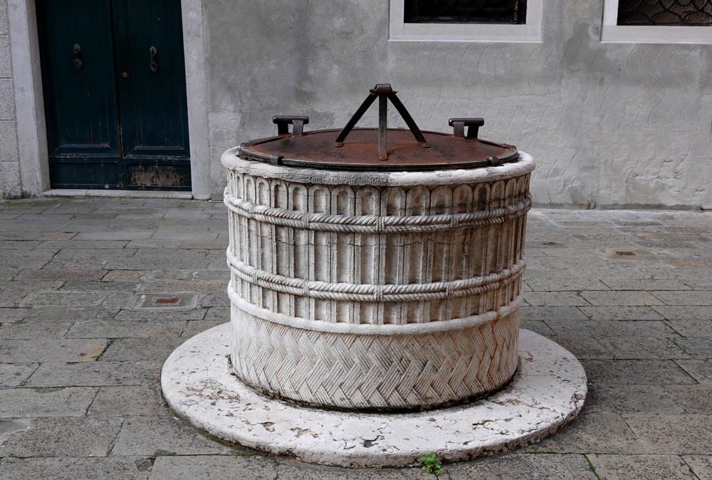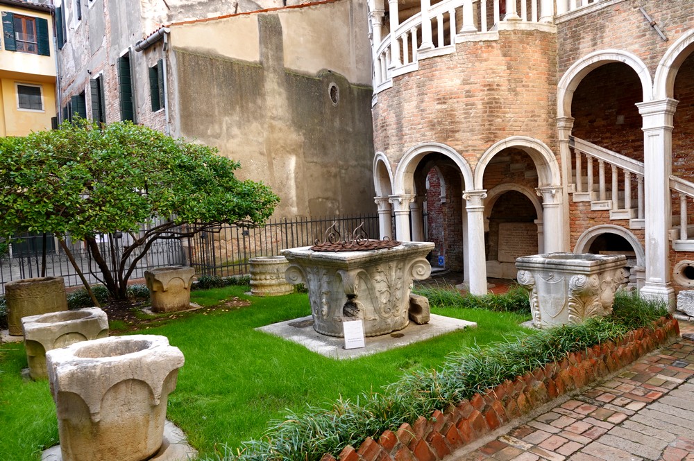 Nos pas nous mènent ensuite vers le palais Contarini, connu pour son somptueux escalier en colimaçon del Bavolo – style Renaissance fin XVe siècle – au pied duquel un petit jardin renferme margelles de puits et éléments architecturaux.