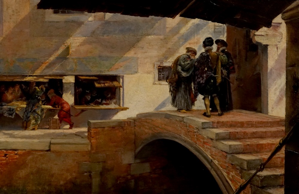 Nous arrivons ensuite au Palazzo Fortuny, datant du XVe siècle, qui, bien qu’étant un des plus grands palais de Venise, ne possède aucune ouverture sur le Grand Canal. Divisé en appartements au XIXe siècle, le bâtiment abrita jusqu’à trois cent cinquante personnes de condition modeste. Il était en piètre état quand, en 1898, Mariano Fortuny loua au dernier étage une immense salle dont la lumière l’avait séduit.