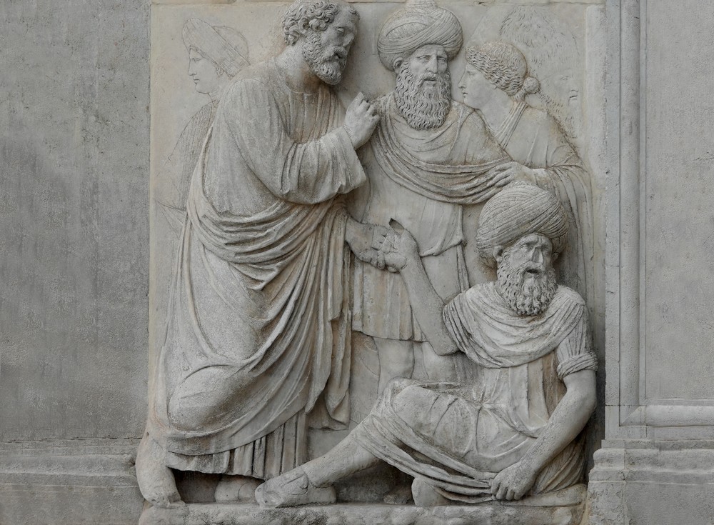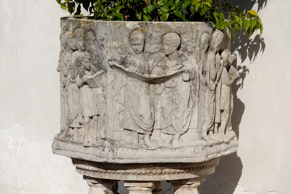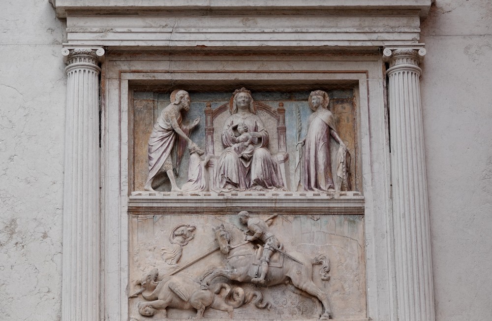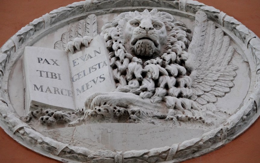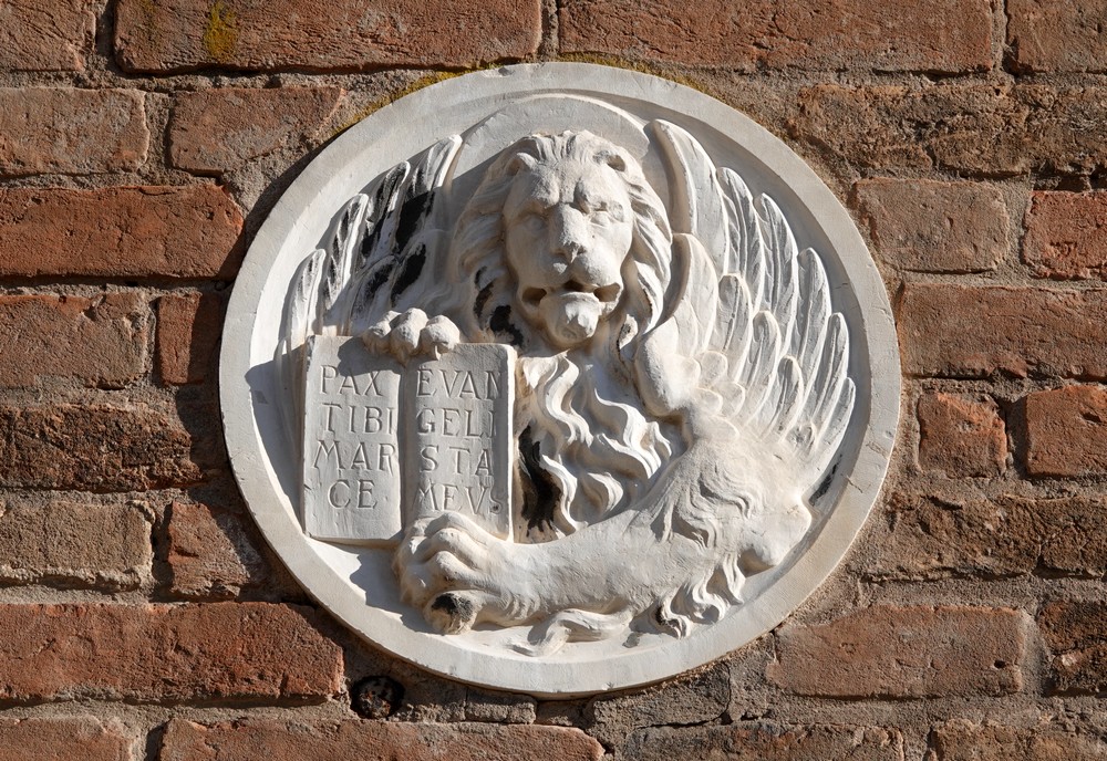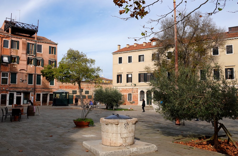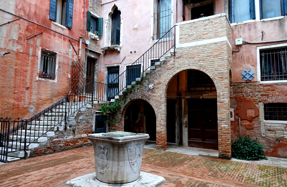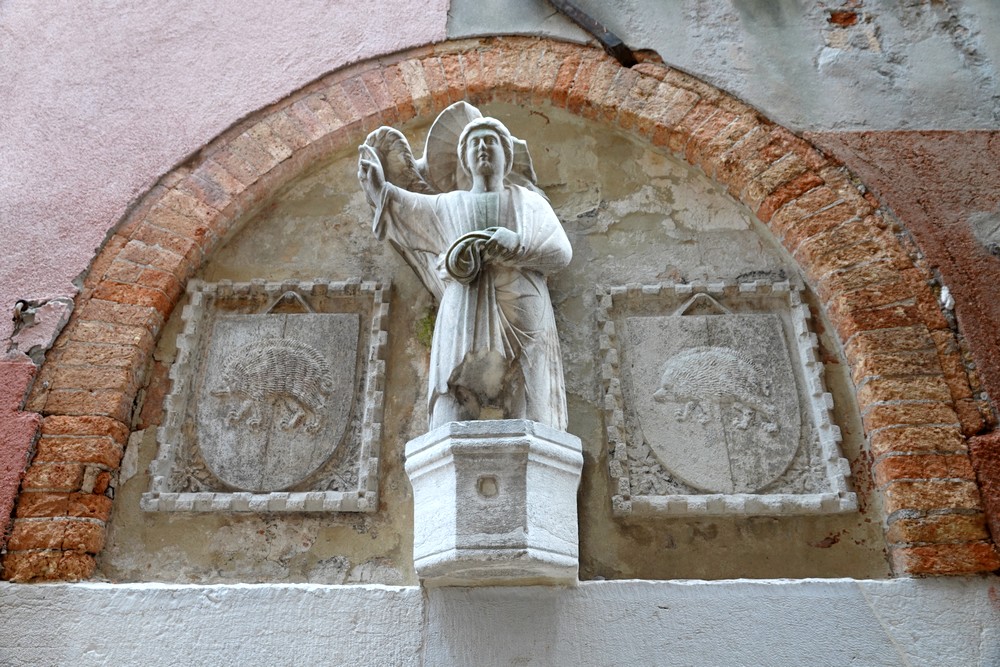 Nous poursuivons vers le Campiello del Piovan, silencieux… En effet, seules trois margelles de puits et quelques arbres occupent les lieux, et chose rare à Venise, il n’y aucun restaurant ni boutique d’artisan pour animer la place ! Et un peu plus loin, notre regard est attiré par quelques reliefs originaux…