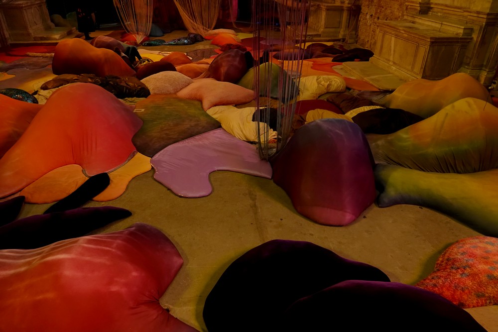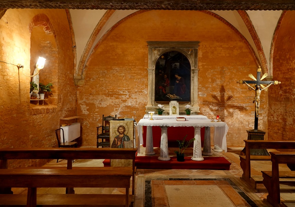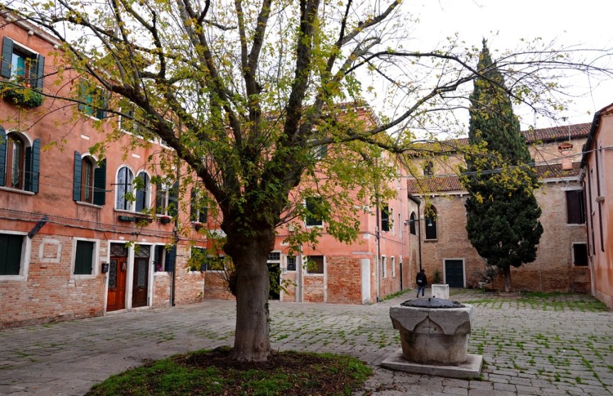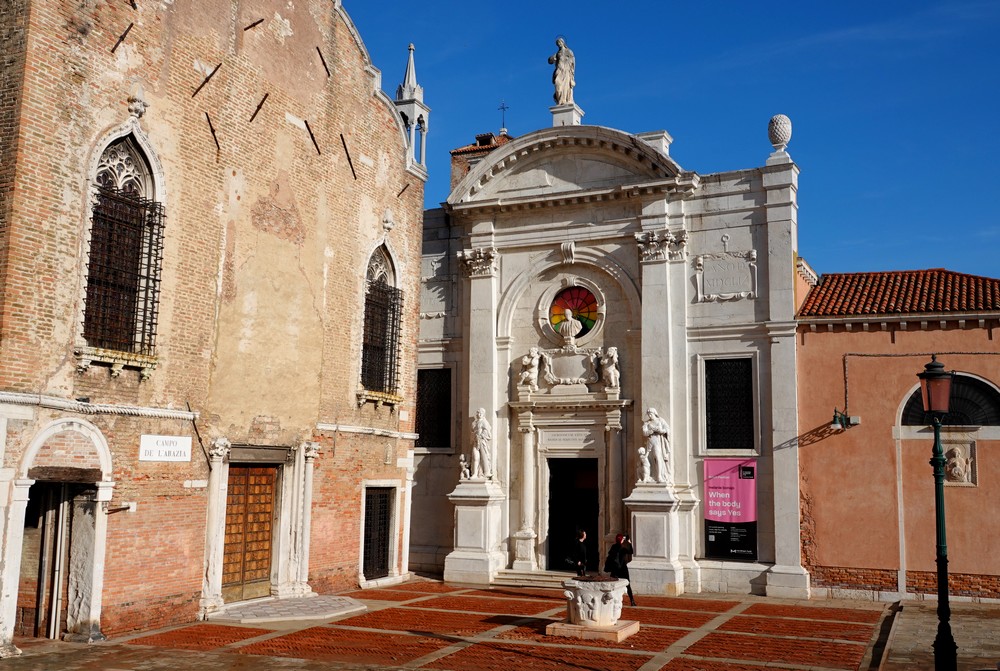 Deux ponts plus tard, nous parvenons face au Campo de l’Abazia, où subsiste encore le pavage en terre cuite d’origine, et sur laquelle se dresse la jolie église Santa Maria della Misericordia. Désacralisée, celle-ci abrite actuellement une curieuse expo qui se visite sans chaussures, où l’on regarde des vidéos avant-gardistes, confortablement installés sur de gros coussins posés au sol…