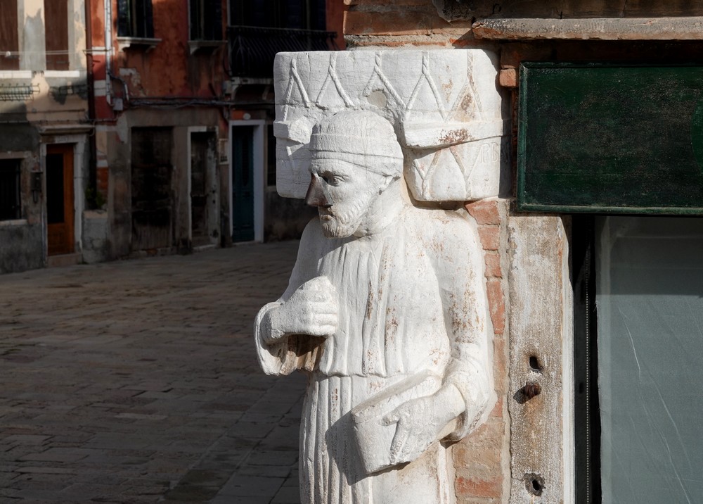 La promenade longe ensuite des canaux déserts, mais nous ne manquons pas d’observer les mille détails qui ornent les façades des maisons, comme par exemple ce chameau apposé sur le Palazzo del Cammello. Cette propriété aurait appartenu à trois frères marchands – Rioba, Sandi et Afani Mastelli – revenus du Péloponnèse à Venise en 1112. La fratrie serait aussi représentée sur le Campo dei Mori, par les statues des trois maures et de leur serviteur. Des réalisations qui nous plongent au cœur de l’Orient !