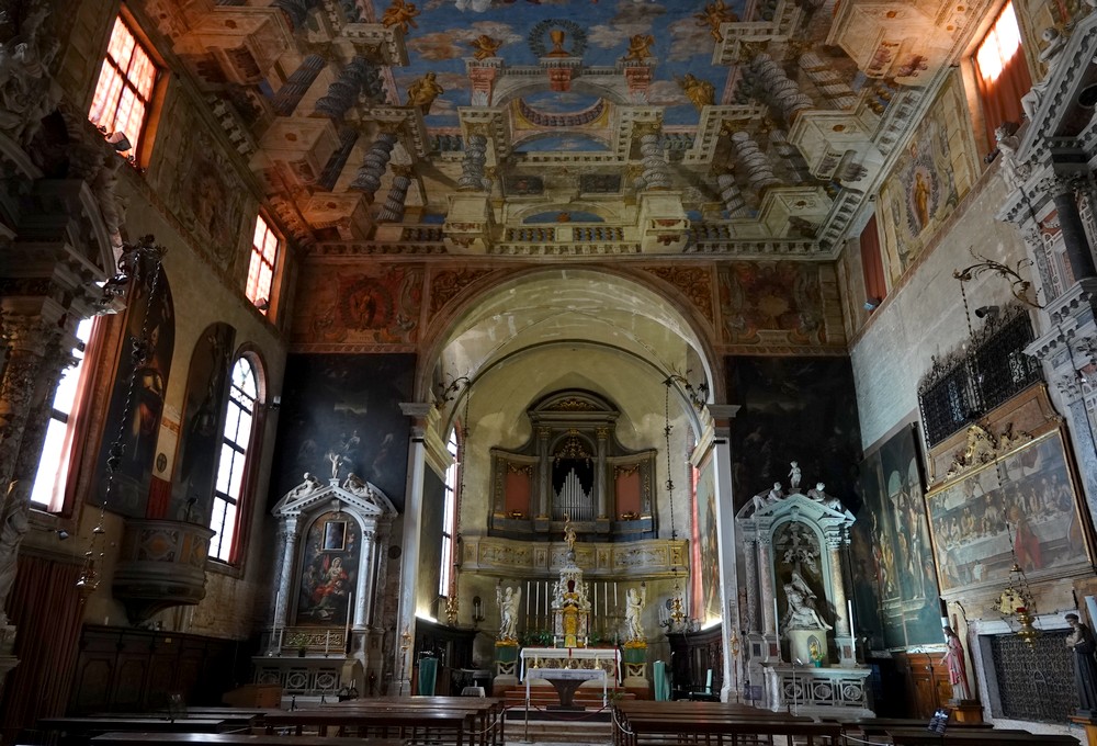 Faute de pont, aucun itinéraire en ligne droite n’est possible pour rejoindre le Campo Sant’Alvise ! Nous longeons alors le Rio de la Sensa avant de bifurquer Calle del Capitelo pour enfin nous retrouver face à la très austère église Sant’Alvise. Néanmoins, la richesse de l’intérieur contraste avec la sobriété de son extérieur, où plafond peint et nombreuses toiles ornent les murs. Un décor très chargé, un peu perturbant pour l’œil qui, dans une pénombre certaine, peine à se fixer sur un point précis !