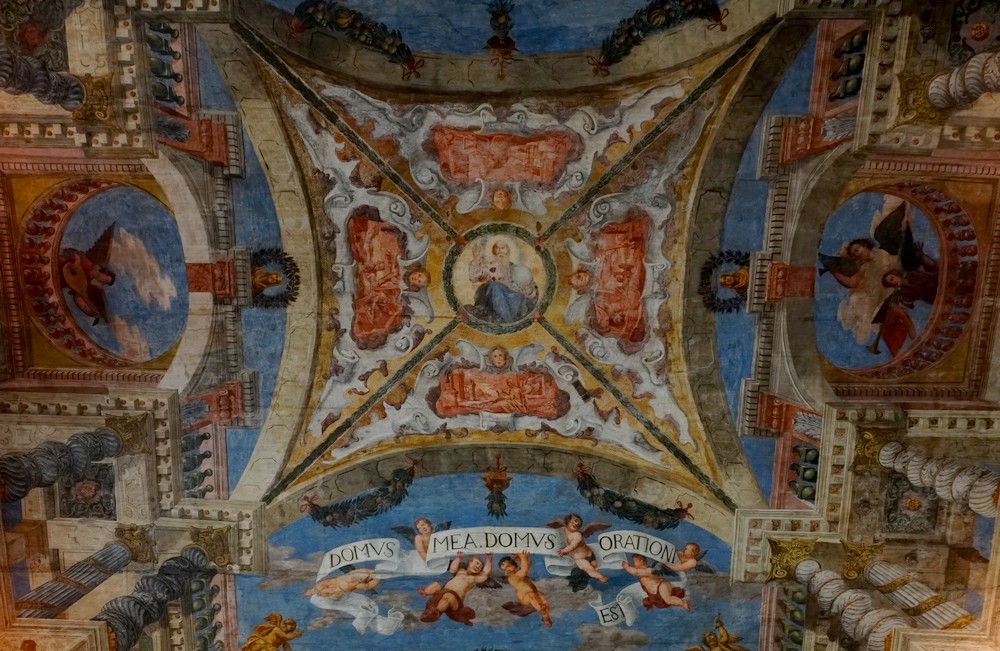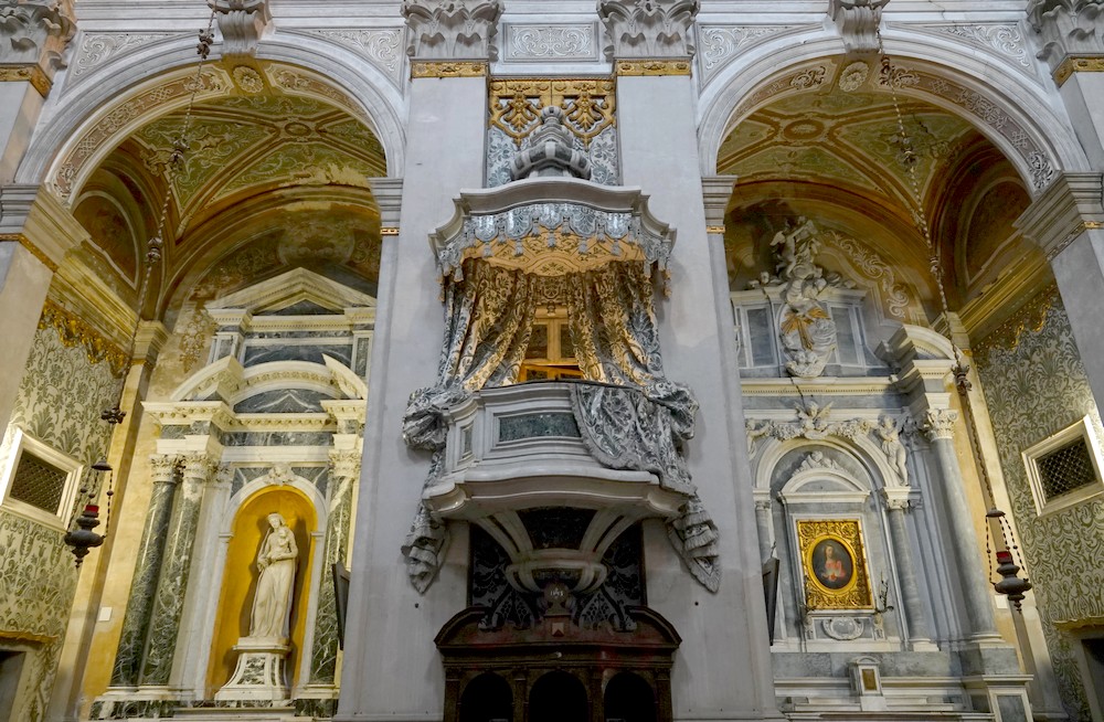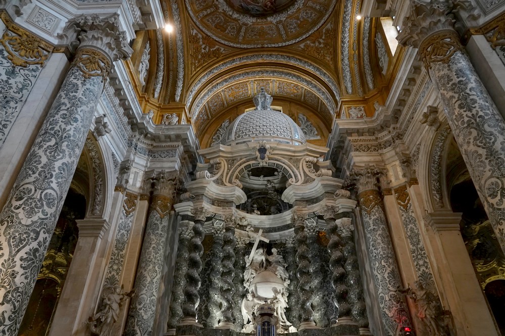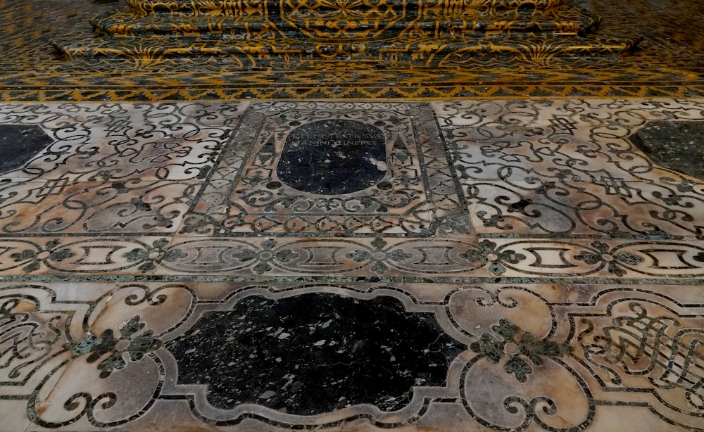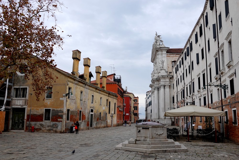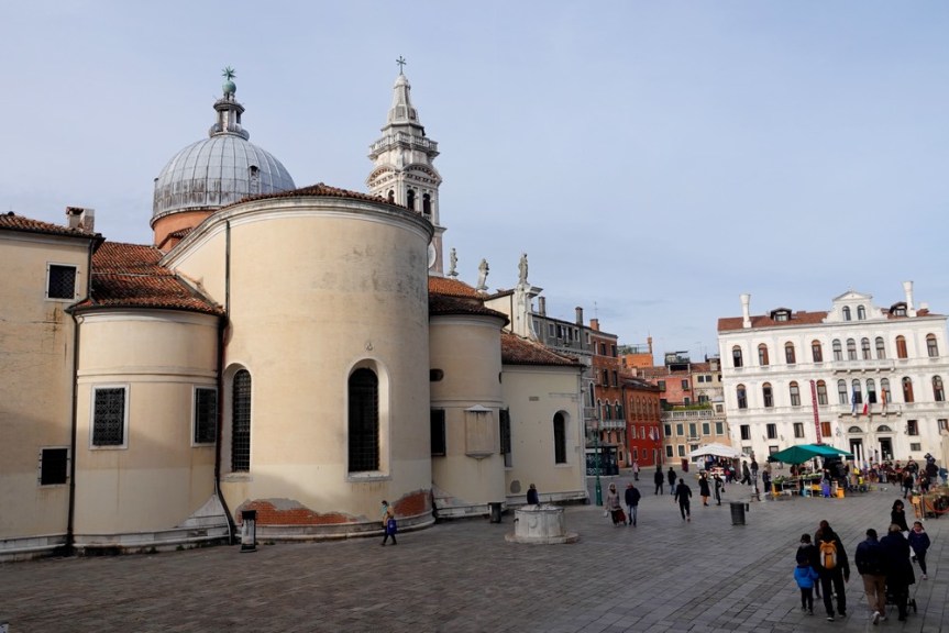 Puis c’est sous quelques gouttes de pluie que nous arrivons sur le Campo dei Gesuiti. L’église du même nom est fascinante par son déploiement de marqueteries de marbre, avec d’époustouflants effets de tentures et un plafond enrichi de stucs dorés… Un style baroque poussé à son paroxysme, loin de l’habituelle austérité prônée par les Jésuites…