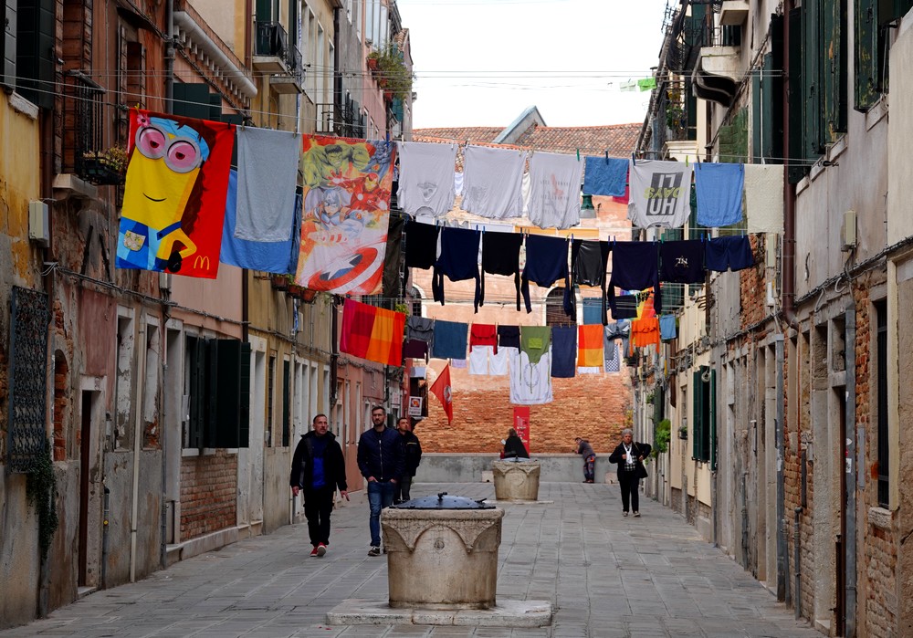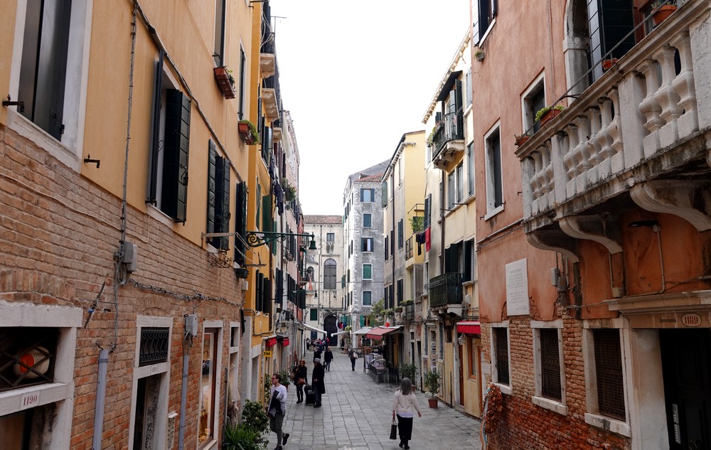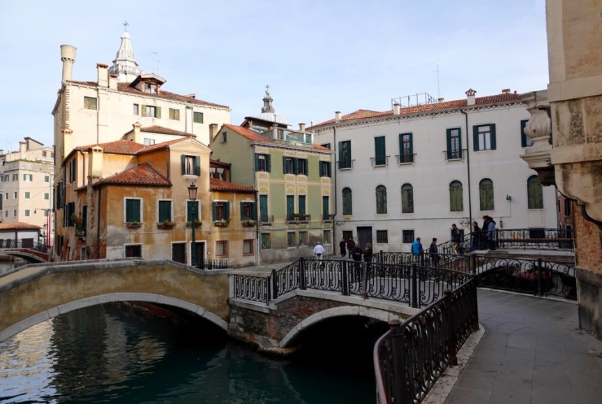 Nous débarquons du vaporetto à la station Ca’ d’Oro, et immédiatement nous nous enfonçons dans les ruelles étroites de Cannaregio. Au bout de la Fondamenta San Felice, nous découvrons le Ponte Chiodo qui est l’ultime pont sans parapet de Venise, si l’on excepte celui de Torcello : en effet, les rambardes ont été ajoutés bien après la construction des ponts, pour éviter que trop de monde ne tombe à l’eau ! D’ailleurs, ce type d’accident était si courant qu’autrefois Il Gazzetino, le journal de Venise, donnait chaque jour les noms des gens tombés à l’eau la veille. Toujours à propos de ponts, on en dénombrerait – d’après différentes sources – entre 435 et 455, passages indispensables pour relier les 121 iles de la ville.