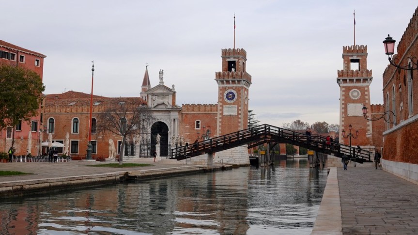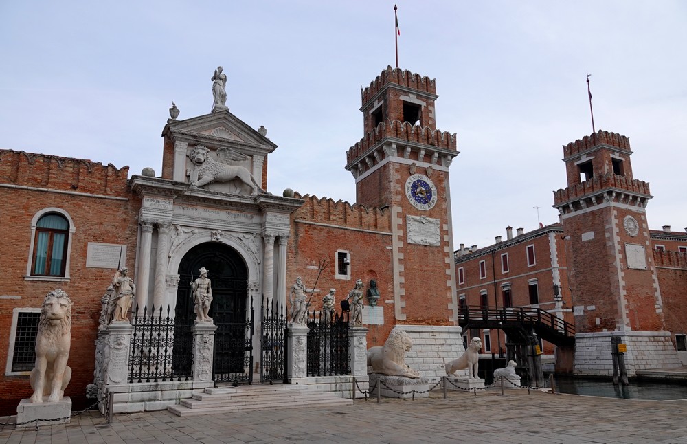 Dernière balade de cet article, nous prenons aujourd’hui la direction de la Porte de la Mer… Et c’est à pied depuis Sant Elena que nous rejoignons l’Arsenal, installé au milieu du quartier de Castello. Véritable forteresse, ce chantier naval fut, dès le XIIe siècle, le symbole de la puissance maritime de Venise. L’entrée de l’Arsenal est majestueuse avec ses quatre lions alignés de part et d’autre de la porte… Le quartier est très calme en ce début de matinée, et on peine à imaginer que, par le passé, maitres charpentiers, fondeurs et autres corps de métier s’activaient sans relâche, tandis que les femmes étaient concentrées sur l’entretien des voiles et les enfants, dès 10 ans, employés à la fabrique de cordes…