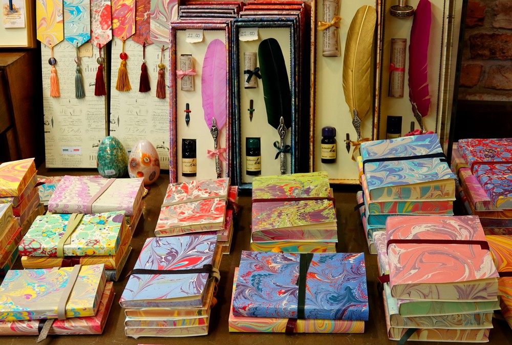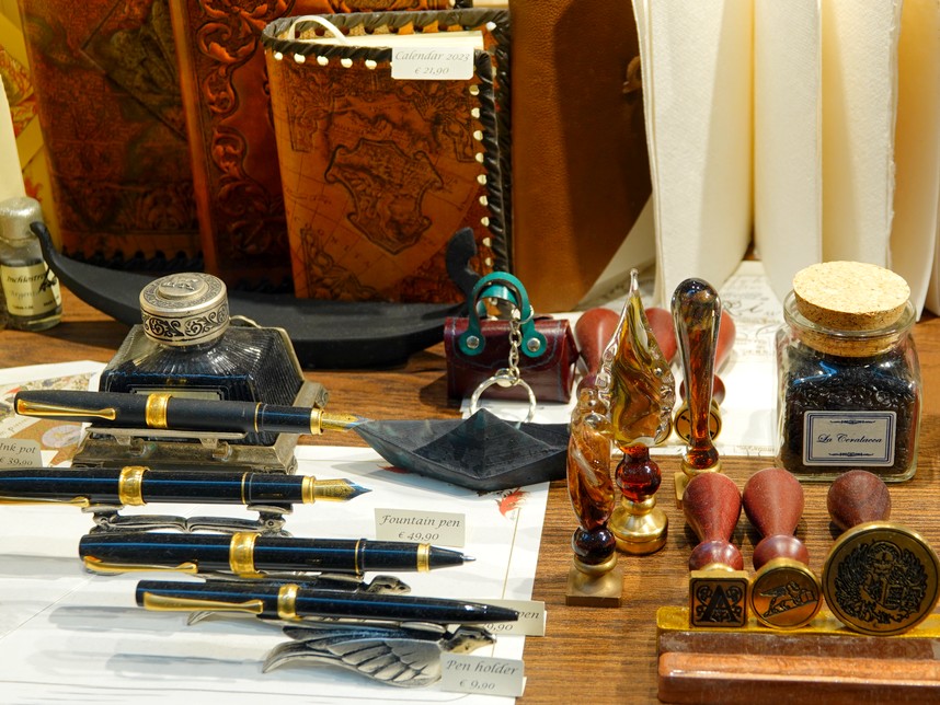 Pour rejoindre le campo Francesco della Vigna et l’église du même nom, nous longeons quelques rues commerçantes où nous ne pouvons nous empêcher d’admirer les vitrines présentant différents objets utiles à la calligraphie. Une fois de plus, nous réfrénons nos envies d’achats, et nous contentons de craquer pour un magnet artisanal : au moins, il ne prendra pas de place dans le sac !