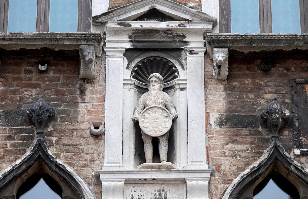 Quelques ponts plus loin, nous arrivons au Campo Santa Maria qui fait face à la belle église Santa Maria dei Miracoli, remarquable par sa façade de marbres polychromes. Mais la sculpture la plus surprenante du quartier est celle d’un « sauvage » couvert de poils portant un disque solaire. Étonnant !