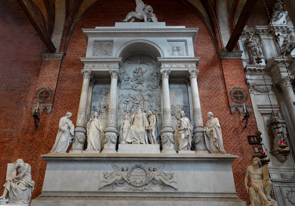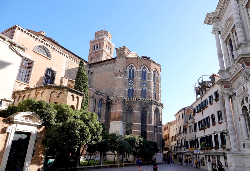 Une rue plus loin, on arrive au Campo dei Frari qui est largement dominé par la Basilique Santa Maria Gloriosa dei Frari. Plus grande église gothique de la ville – avec l’église de SS Giovanni et Paolo – elle fut commencée en 1335 sur l’emplacement d’une autre petit église, puis achevée et consacrée en 1492. Mausolée de plusieurs doges et autres personnages éminents de la Sérénissime, elle abrite, entre autres, les monuments funéraires du sculpteur Cannova et du peintre Tiziano Vecellio, dit Le Titien.
