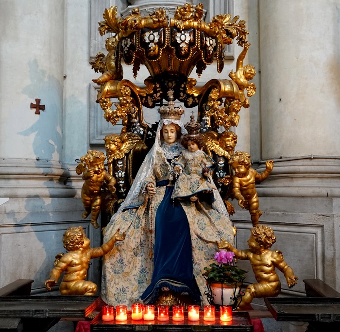 Nous retournons ensuite sur les Zattere où nous visitons l’église de Sainte Marie du Rosaire – aussi connue sous le nom de Gesuati – fondée par les dominicains au XVIIIe siècle. Elle arbore un style rococo à souhait, fait de fresques et de sculptures élaborées.