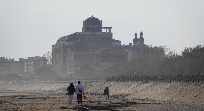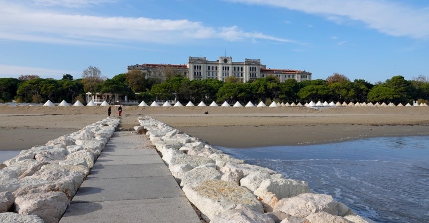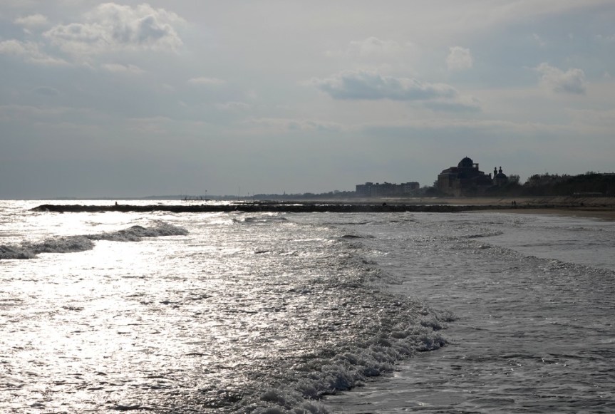 De retour non loin de l’embarcadère du vaporetto, nous nous baladons un moment sur le Gran Viale bordé par quelques beaux hôtels, puis nous poussons jusqu’à la Plage Des Bains qui fait face à l’ancien Hôtel des Bains à l’abandon depuis 2010 – hôtel où se déroule l’action de Mort à Venise, le roman de Thomas Mann dont Visconti tira un très beau film. Depuis la plage, on aperçoit l’imposante architecture mauresque du Grand Hôtel Excelsior…