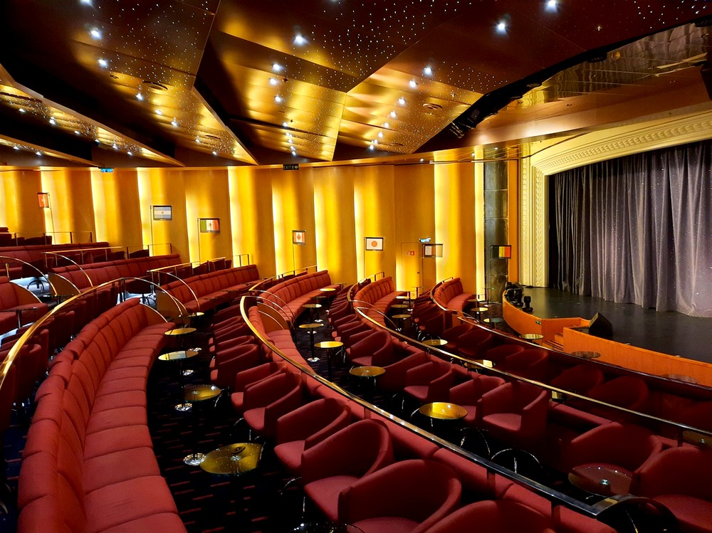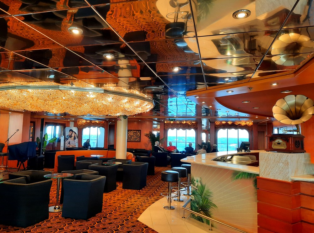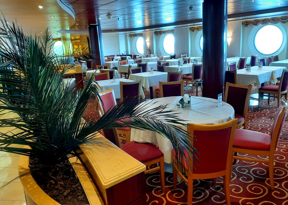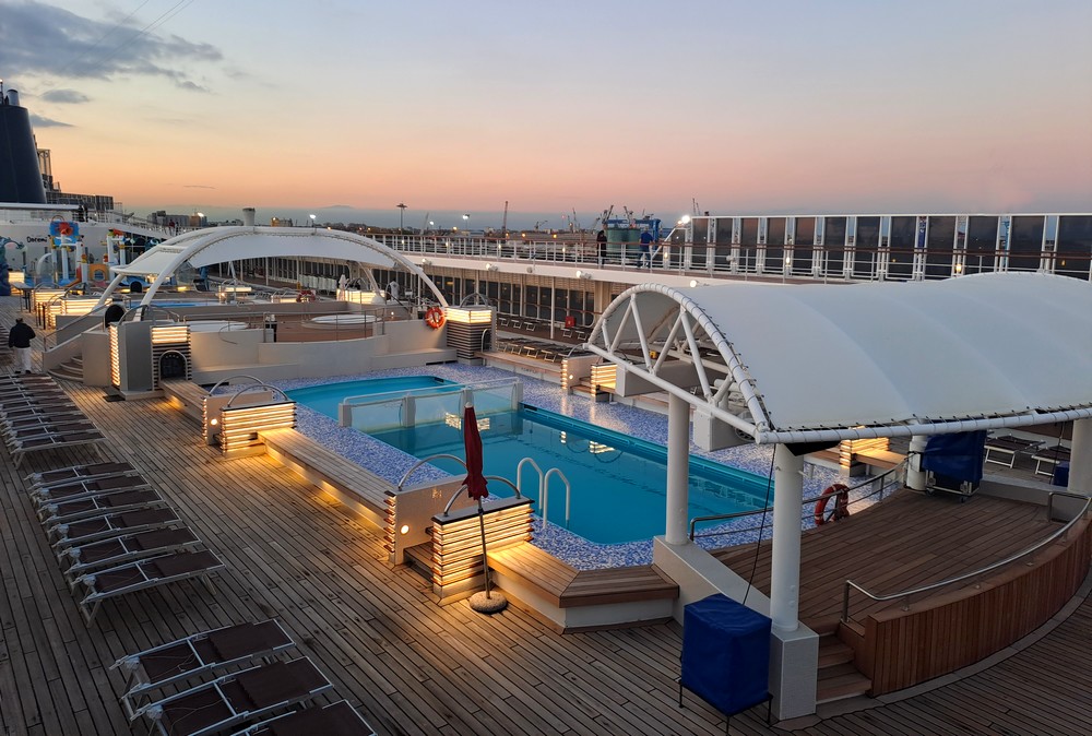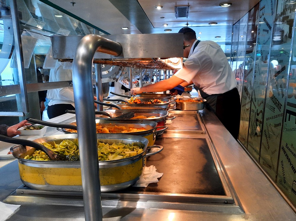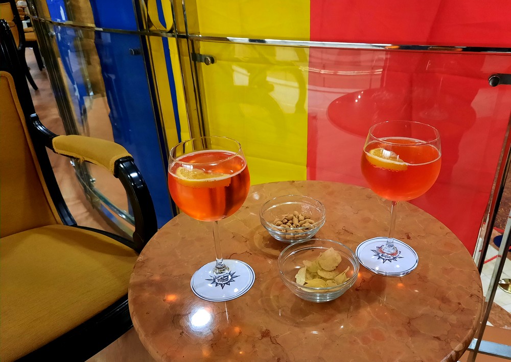 C’est après un ultime trajet très matinal sur le Grand Canal à bord d’un vaporetto de la ligne 1, suivi d’un court trajet en Moover – un métro aérien – que nous rejoignons la gare maritime de Venise. Si les paquebots n’accostent plus à cet endroit depuis quelques années déjà, les formalités d’embarquement s’effectuent toujours ici. Après un contrôle rapide des certificats de vaccination, tests antigéniques, tickets de voyage et passeports, l’attente est ensuite assez longue pour que nous soit délivrée notre carte de croisière – véritable sésame de notre voyage qui nous servira autant à ouvrir la porte de notre cabine qu’à régler nos consommations ou autres dépenses à bord. Finalement, vers 13h30, nous montons à bord d’une navette maritime qui nous mène en une petite demi-heure jusqu’à l’Armonia, amarré au port de Marghera. Une fois dans le bateau, et après une dernière queue où nos passeports nous sont retirés – si quelqu’un connait la législation exacte en la matière, je suis preneuse, car il n’est jamais agréable d’être ainsi dépossédé de ce précieux laisser-passer de voyage – nous filons sur le pont supérieur où le buffet permet de se restaurer à toute heure de la journée ! Puis nous partons à la découverte du bateau en enchainant les montées et descentes d’escaliers, les ascenseurs étant bondés de passagers qui cherchent leur cabine. Notre première impression est positive : la conception du bateau étant assez ancienne, il est à « taille humaine » et ne n’affiche aucun clinquant superflu. Tant mieux ! Néanmoins, les infrastructures sont de très bon niveau avec piscine, pont pour la marche, salle de sport, théâtre et nombreux salons… Après avoir récupéré les bagages dans la cabine – installée sur le pont 9 – et sacrifié à l’indispensable exercice de sécurité, il ne nous reste qu’à siroter un apéritif bien mérité au bar del Duomo, puis à rejoindre la Pergola, le restaurant qui nous a été attribué pour le diner. Diner dont la qualité se révèle nettement au-dessus de nos attentes !