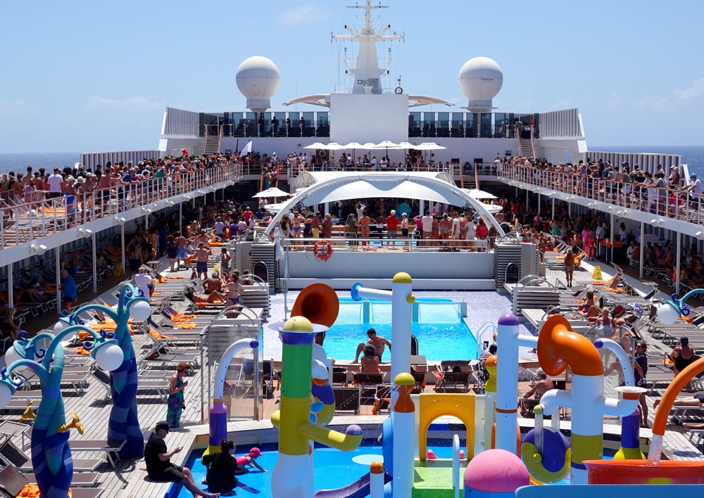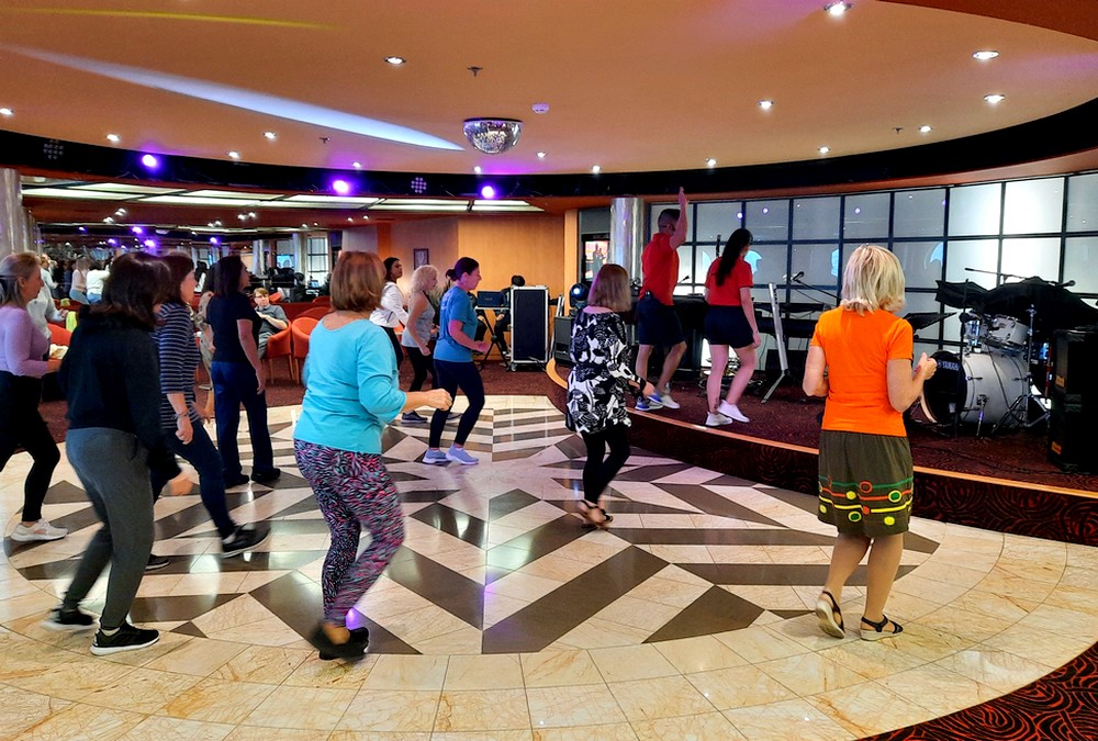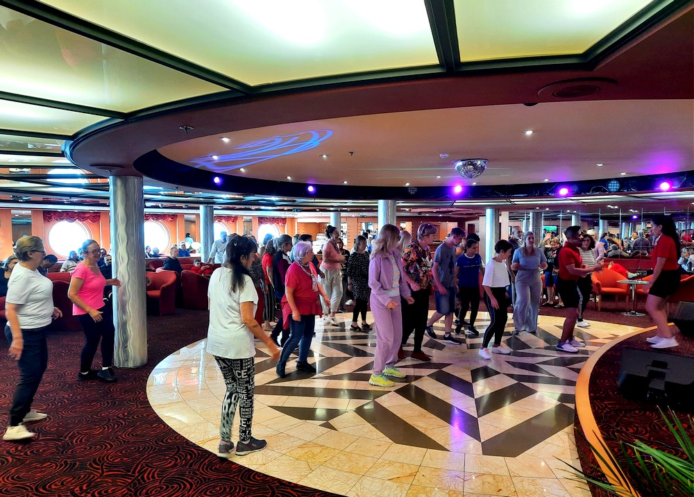 Même les jours de mauvais temps, nous ne nous ennuyons pas ! La plupart de nos journées sont rythmées par les séances de sport, en extérieur – marche sur le pont 12, entre cinq et dix kilomètres par jour, ce qui représente une à deux heures quotidiennes – à la salle de gym – vélo, rameur et autres instruments de torture sont installés face à la mer, ce qui ne gâche rien – ou dans les salons – pour les leçons de danse et de fitness, où je remarque rapidement que se trémousser sur un rythme brésilien n’est pas si évident que ça !