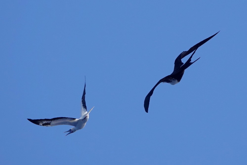 Alors que les côtes brésiliennes sont encore à 400km de distance, nous avons la chance d’observer le vol de fous de Bassan (merci Michel pour la correction !) et de frégates : superbe !