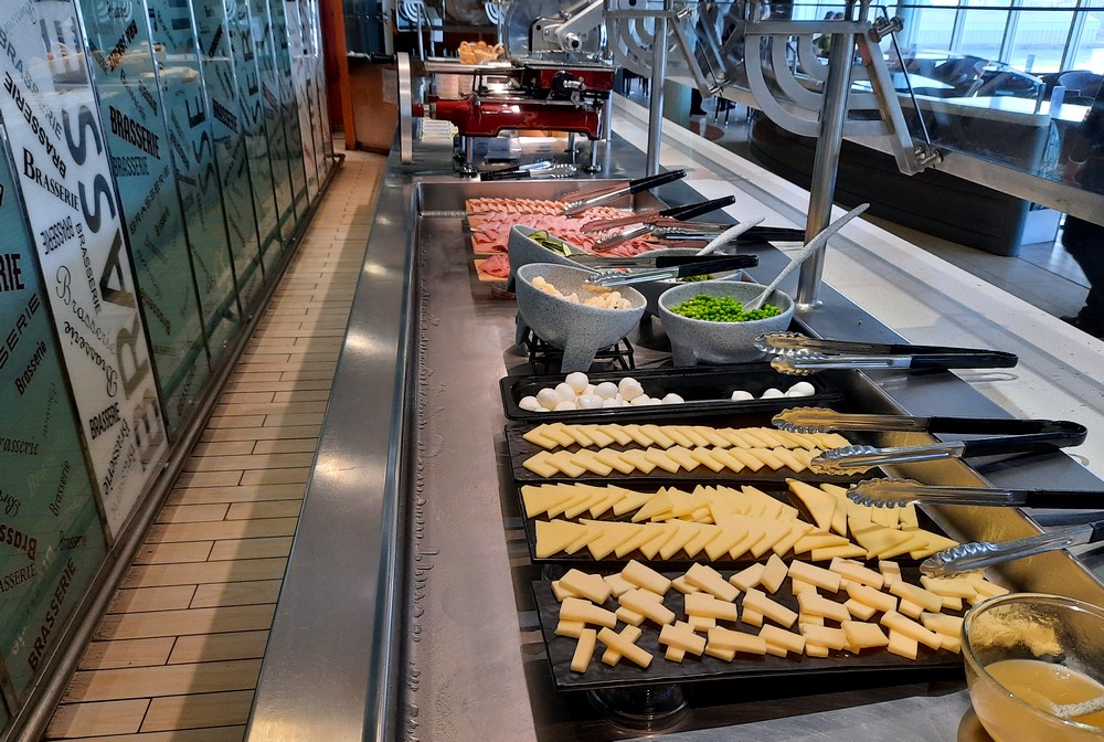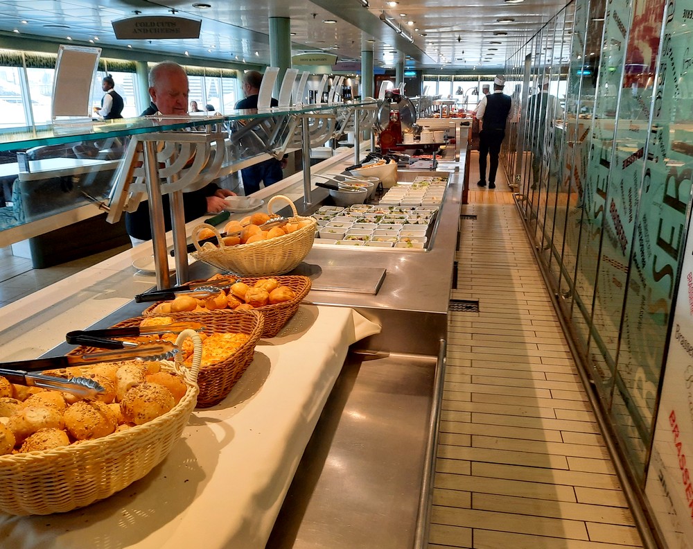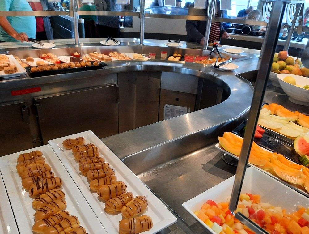 C’est bien connu, en croisière, il est possible de manger toute la journée ! Comme nous sommes d’un naturel plutôt raisonnable – et surtout parce que nous n’avons aucune envie de débarquer au Brésil alourdi de plusieurs kilos supplémentaires – nous nous contentons de trois repas par jour ! Nous prenons généralement le petit-déjeuner au buffet – très complet, tant sur le salé que sur le sucré – mais les mets sont plus fins au restaurant – œufs pochés à la florentine, saumon fumé, etc.