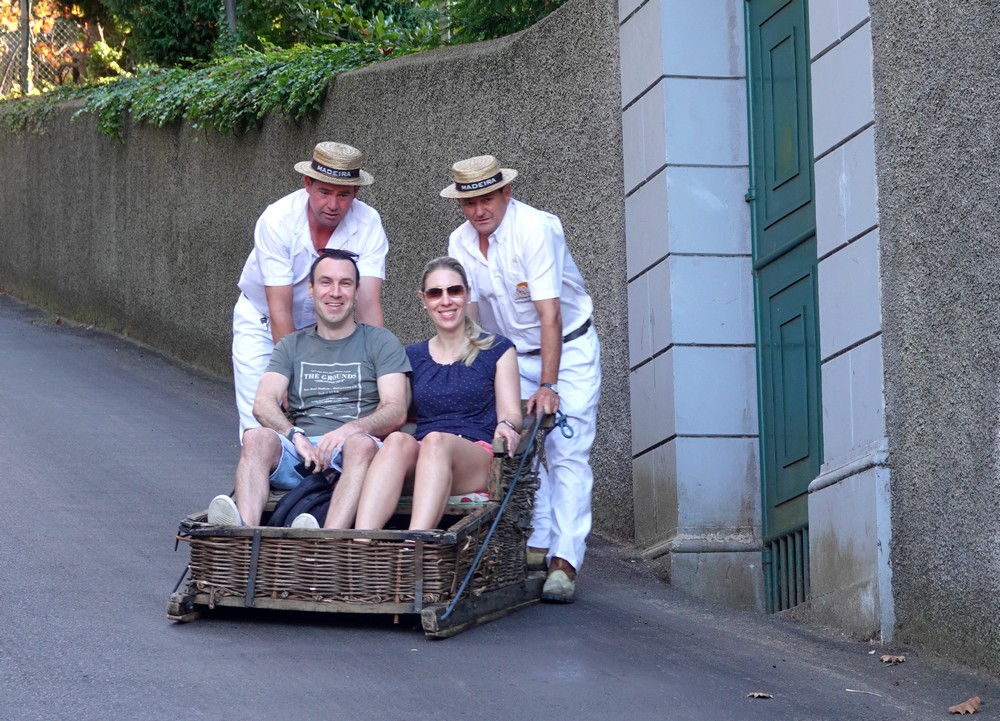 Après une belle grimpette pour rejoindre la sortie du jardin, nous passons un bon moment à observer le départ des fameuses « luges » qui font la célébrité de Madère depuis le milieu du XIXe siècle, les Carros de Cesto ! Eh oui, à cette époque déjà, les riches familles de Funchal aimaient se rendre à Monte en funiculaire – il n’existe malheureusement plus – d’où ils embarquaient dans de drôles de paniers d’osier, dirigés par deux carreiros.