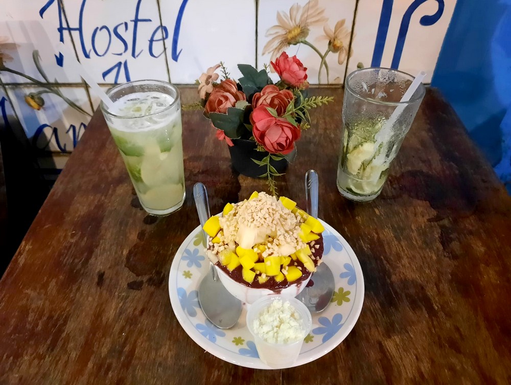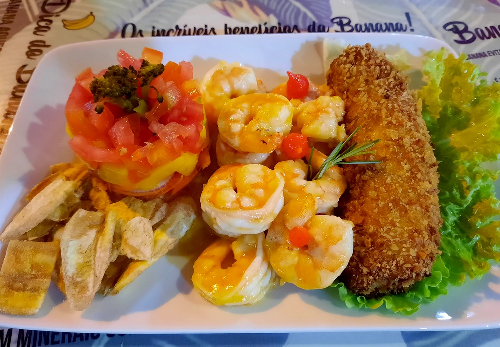 Nous dinons ensuite dans un restaurant spécialisé dans les bananes fourrées et frites – dit comme ça, c’est surprenant et peu engageant, mais comme nous sommes curieux, nous n’hésitons pas ! Nous testons donc deux saveurs différentes : la première est une banane fourrée au poisson, accompagnée de crevettes poêlées servies tièdes et d’une salade de fruits et de légumes crus bien fraiche. La seconde est une banane fourrée au fromage – si, si, ça existe et en plus, c’est bon ! – garnie de morceaux de saucisses aux oignons – on dirait des diots ! – et de chips de banane. Franchement, nous sommes emballés par cette expérience culinaire très originale, savoureuse et de surcroit peu onéreuse !