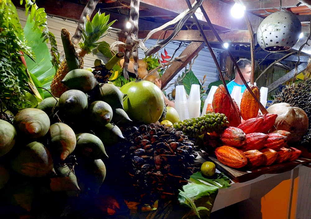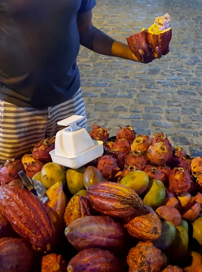 Comme la veille, la rue est bien animée, et ce soir il y a même quelques orchestres installés çà et là. Puisque l’on est dans les expériences culinaires, dans une échoppe mobile, nous testons la cabosse de cacao dont on suce la pulpe qui entoure les fèves : le gout est légèrement acidulé, mais la sensation, plutôt gluante en bouche, nous ne convainc pas !