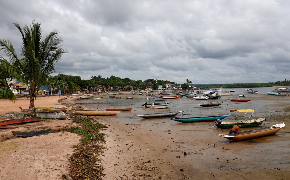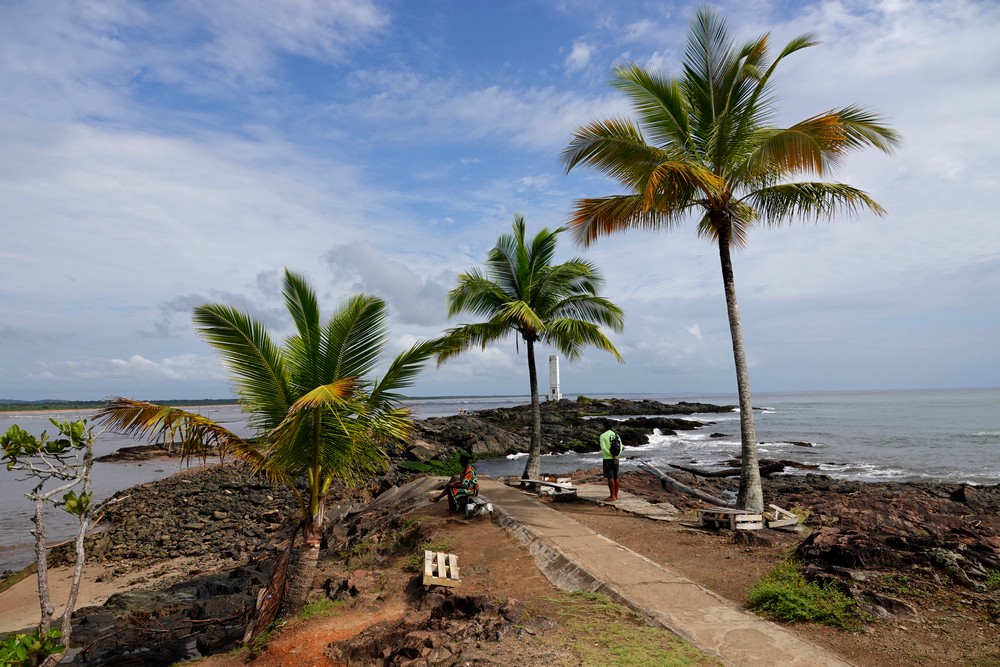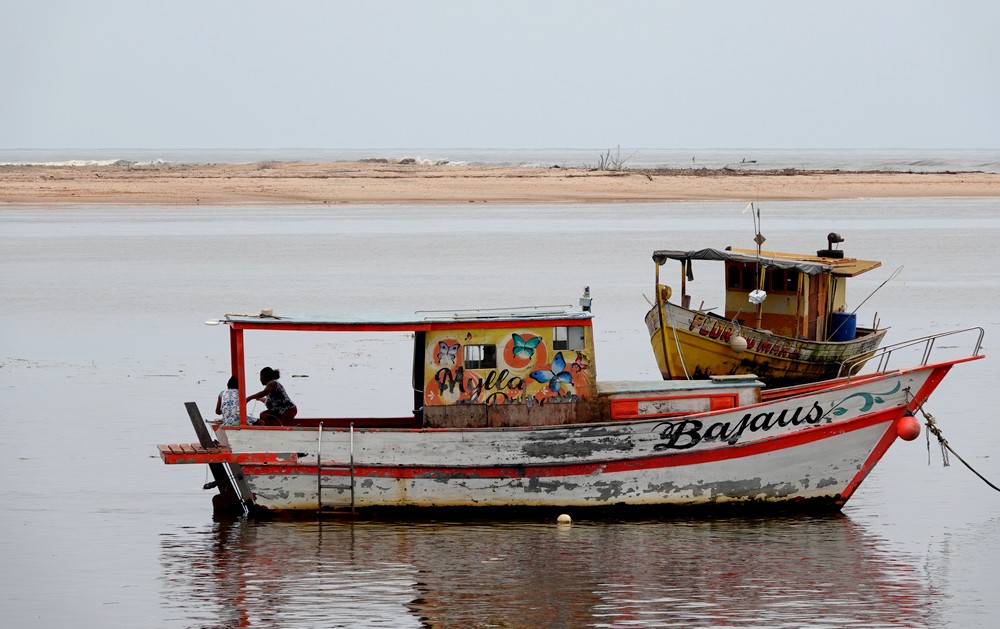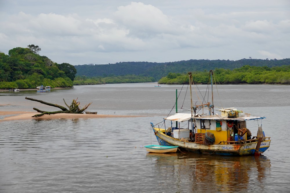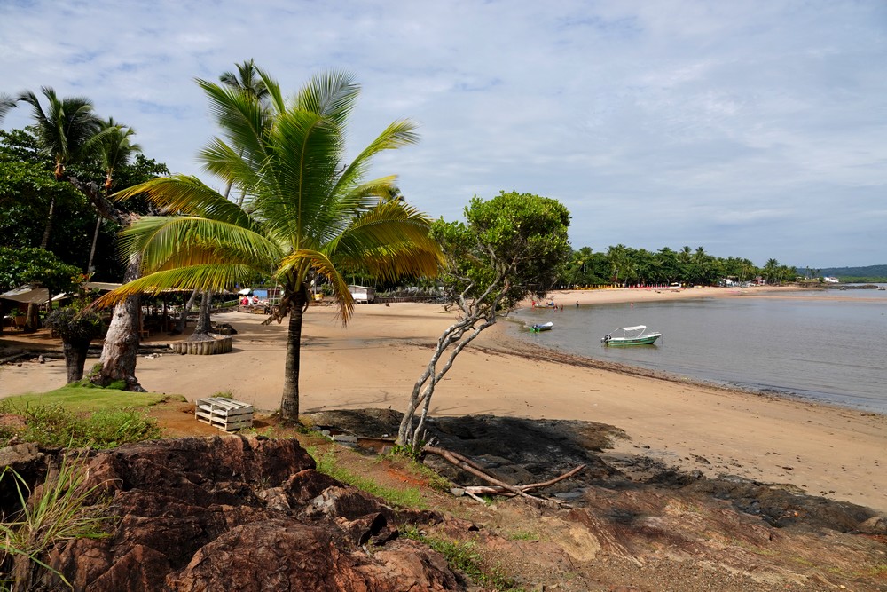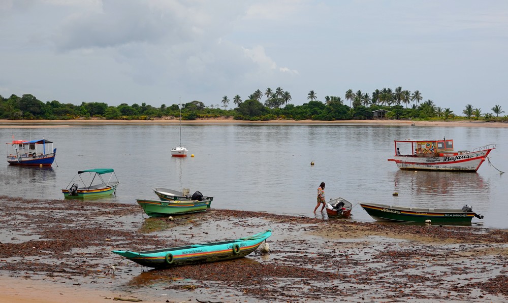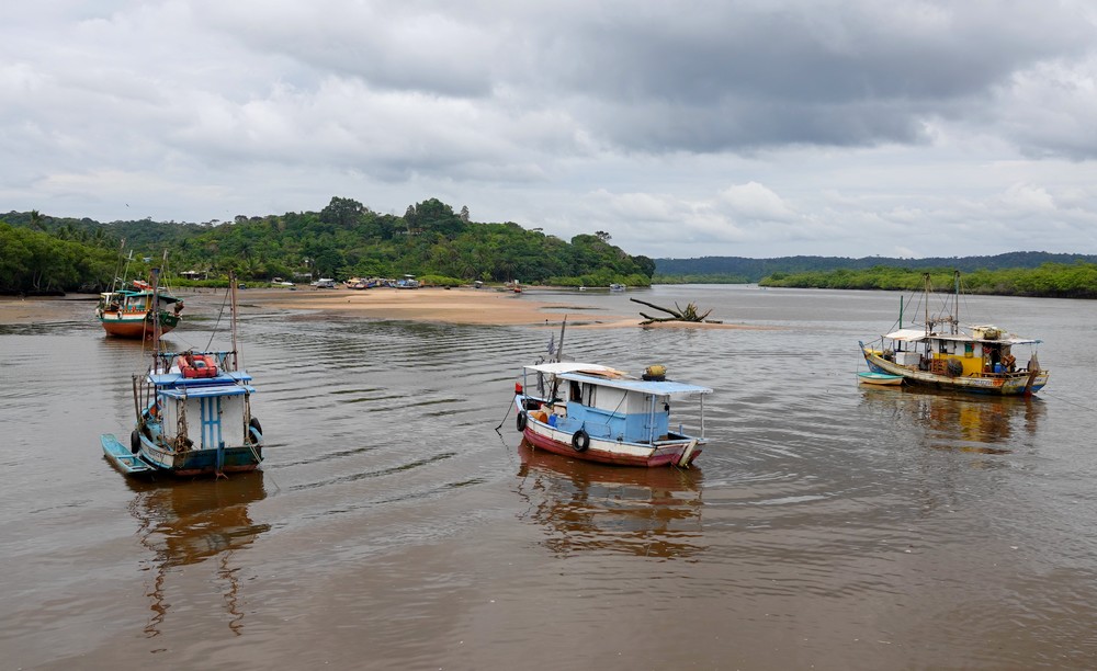 Du coup, on ne s’attarde pas vraiment, et nous nous dirigeons rapidement vers le Mirante do Xaréu, situé à l’autre bout de la plage. Ici, nous sommes juste à l’embouchure de la rivière Contas, et face à nous, sur l’autre rive, s’étend la plage du Pontal, sauvage et déserte. Comme le ciel est gris, nous nous contentons d’observer oiseaux – dont de nombreux vautours noirs à l’allure inquiétante – et pirogues qui passent sous nos yeux. Par beau temps, je suppose qu’il doit être agréable de se poser une heure ou deux sur cette plage, a priori facilement accessible par ferry – si on a bien vu le panneau vers l’embarcadère, en revanche on n’a pas trouvé où se situait le ponton de départ !