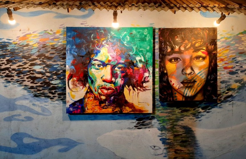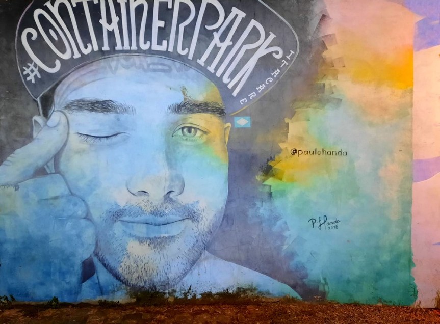 Pas de changement du côté du ciel, les grosses averses tropicales se succèdent ! Hormis une petite sortie rapide pour le déjeuner, on ne bouge pas de l’hôtel – c’est une chance que la chambre soit si agréable et que l’on ait deux terrasses bien abritées de la pluie ! Gérard tente tout de même d’aller jusqu’à la Praia da Concha mais il la découvre envahie de débris végétaux – mais finalement, il rentre rapidement car il recommence à pleuvoir… Dans la soirée, on profite d’une belle accalmie pour flâner dans la rue piétonne – on découvre une galerie de peinture avec des toiles originales et deux beaux murs peints.