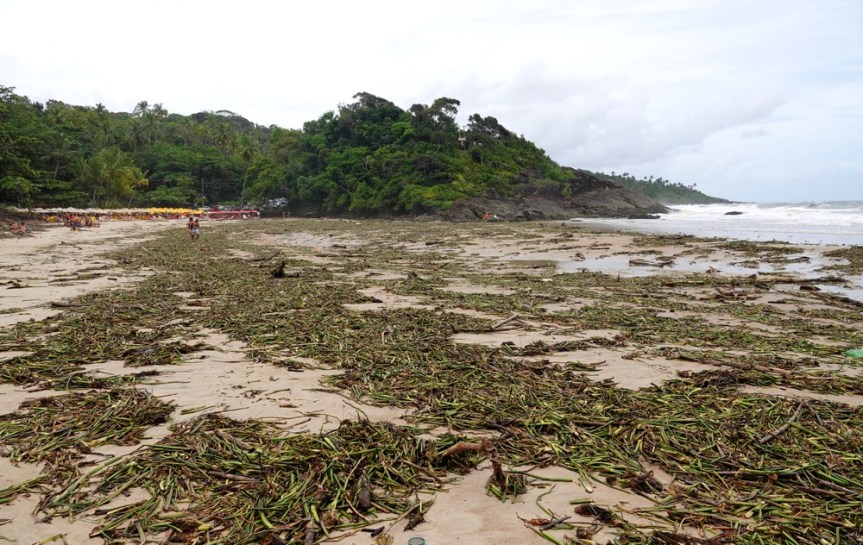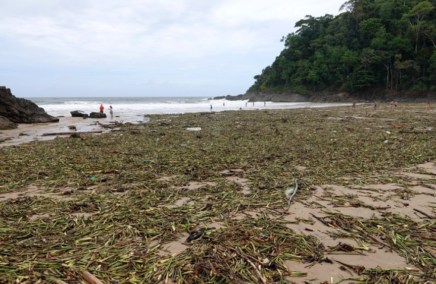 La pluie a enfin cessé mais le plafond reste bas, et nous avons l’impression d’être bloqués dans une étuve ! Nous avions prévu une excursion en bateau vers une cascade, mais la rivière ayant charrié d’innombrables débris, on préfère zapper la sortie. On se contente donc d’un tour jusqu’à la Praia da Ribeira, la plus éloignée des quatre plages facilement accessibles depuis le village. Ici aussi, c’est le désastre : branches, troncs d’arbres et autres végétaux jonchent le sable… Il y aura un gros travail de nettoyage à faire !