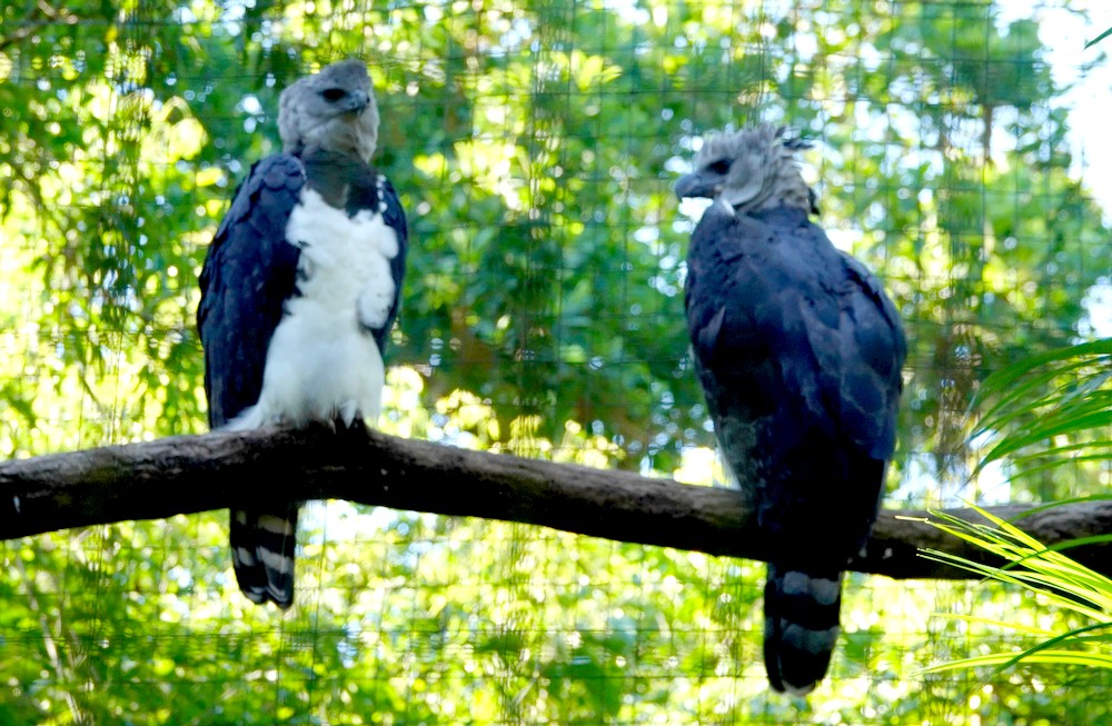 On a ainsi la chance d’apercevoir le Hocco mitouMitu mitu – une espèce de hocco, disparue à l’état sauvage et dont il ne subsiste qu’une quarantaine d’individus vivant en captivité. Non loin, dans une immense volière, un couple de Harpies férocesHarpia harpyja – nous toise depuis le sommet d’un arbre. Cet oiseau, aussi connu au Brésil sous le nom de faucon-royal, est un aigle forestier d’Amérique latine. C’est le plus grand et le plus puissant rapace de la forêt tropicale et il figure parmi les plus grandes espèces d’aigles dans le monde. Mais la destruction de son habitat naturel ayant fortement réduit son aire de répartition, c’est désormais un oiseau en voie de disparition