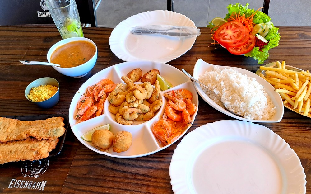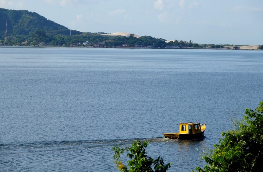 Vers 11h, nous nous installons au Restaurante Bela Ilha où nous dégustons un très bon plat de calamars et crevettes aux légumes, servi avec du riz, des haricots noirs et… des frites, un combo assez surprenant ! Une bonne adresse où il est aussi possible de se baigner dans le lac salé depuis la petite plage privée…