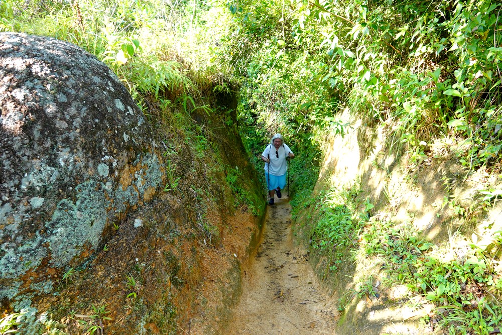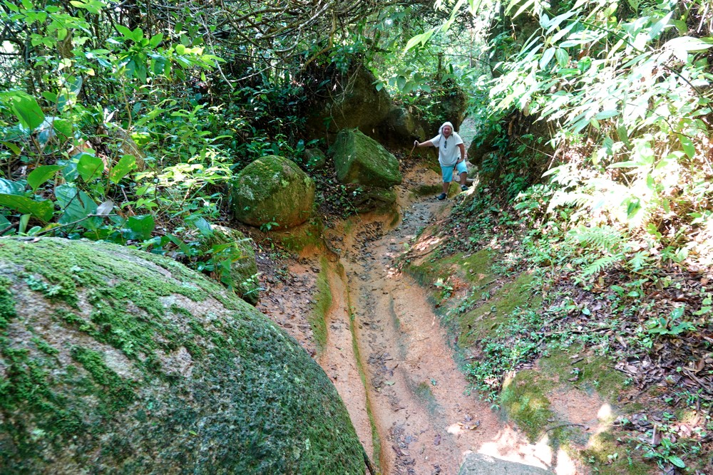 Si le cheminement est très bien tracé, en revanche il faut se méfier des pierres bien glissantes qui composent parfois le sentier : Gérard en fait la dure expérience en effectuant un surprenant – mais très réussi – roulé-boulé dans une descente…