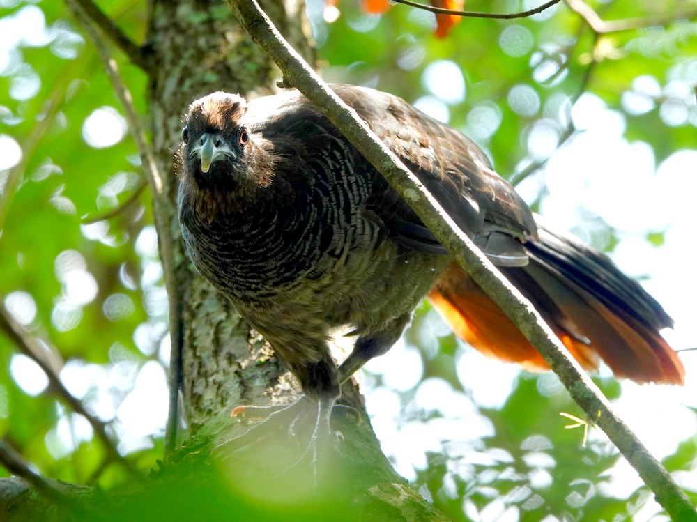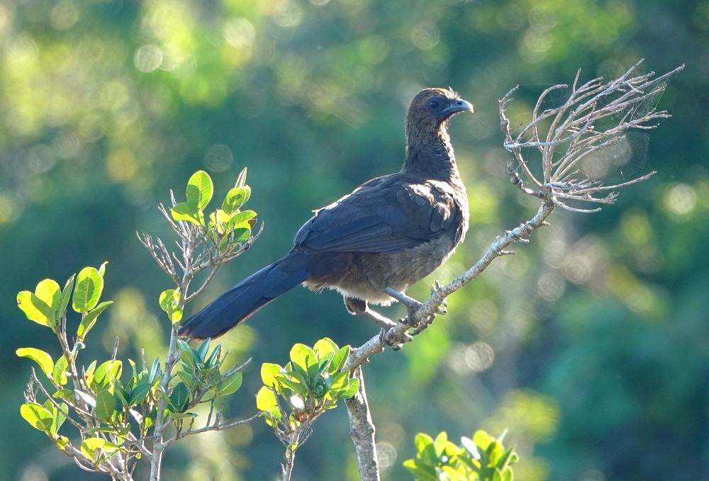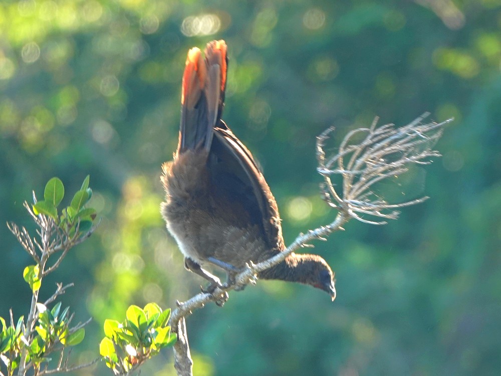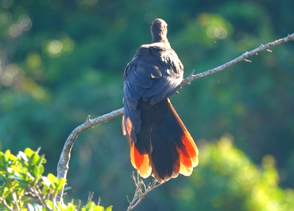 Heureusement, alors qu’il attend que je le rejoigne – hors de question que je courre sur ce sentier au terrain cabossé – il se console avec l’observation d’une belle ortalide aux plumes rousses…