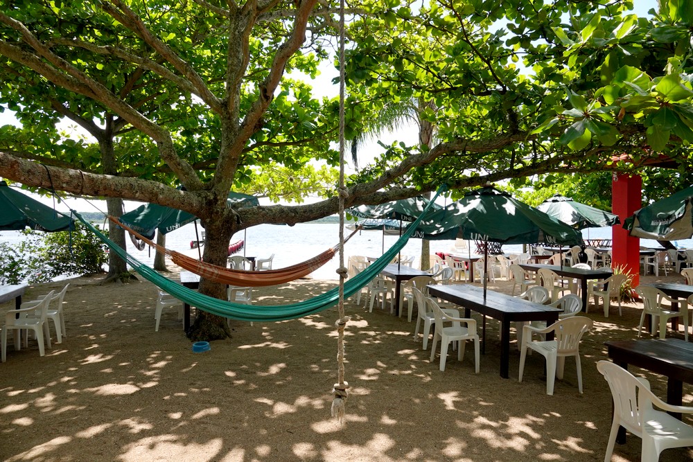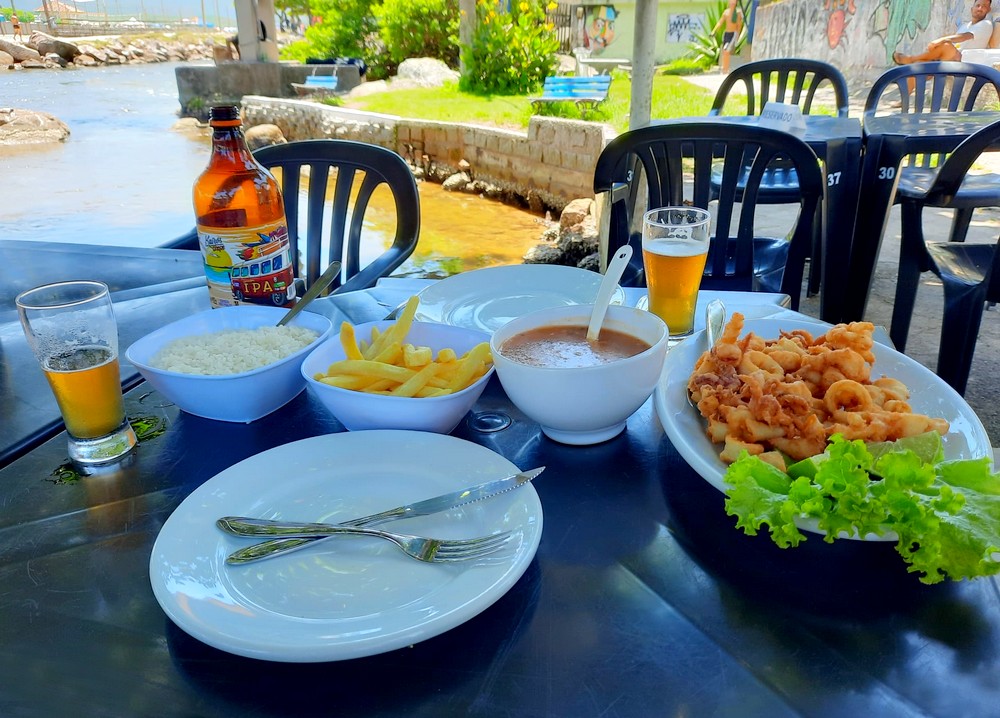 Vers midi, nous rebroussons chemin et nous nous garons de nouveau à Freguesia do Ribeirão. Nous nous attablons au restaurant Muqueca da Ilha dont la terrasse donne directement sur la plage. Si le cadre est agréable et le service souriant, en revanche, concernant les plats, c’est la grosse déception : les huitres gratinées que nous avons commandées sont tellement recouvertes de fromage que l’on ne sent plus le gout du coquillage ! Heureusement, les accras de morue rattrapent un peu le déjeuner, mais globalement, nous ne sommes pas satisfaits de ce repas qui, de surcroit, est un des plus chers depuis notre arrivée au Brésil. Finalement, quitte à y mettre le prix, nous aurions dû tester le Ostradamus Restaurante dont les critiques sont excellentes.