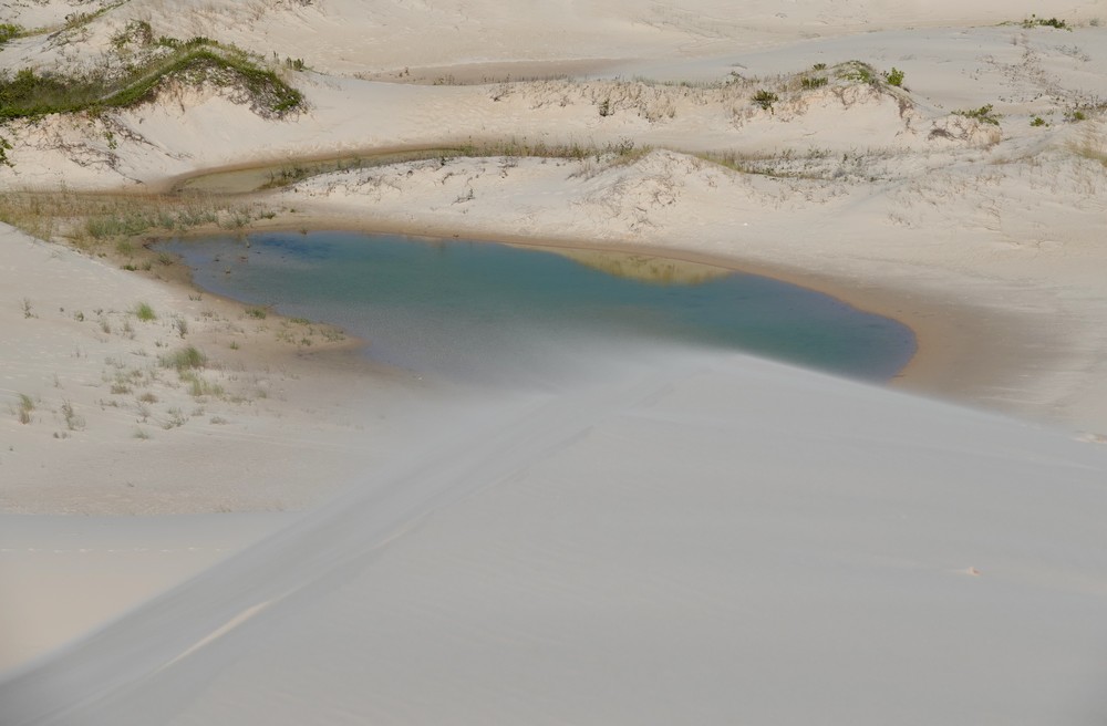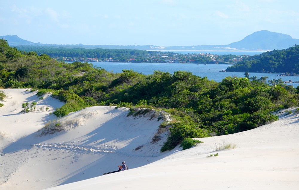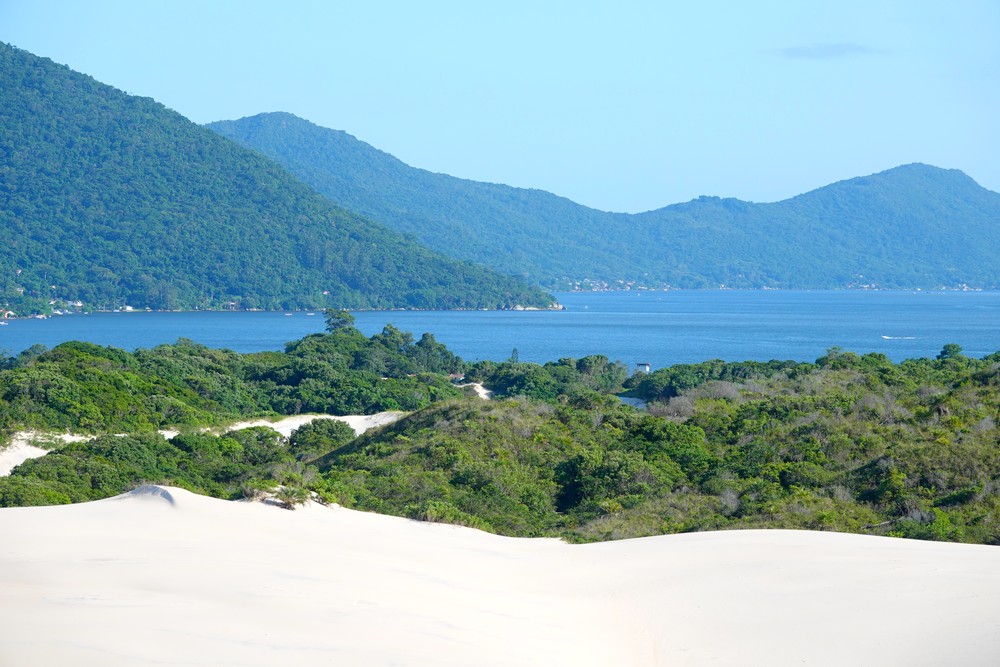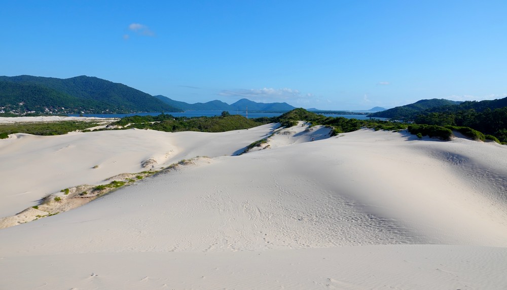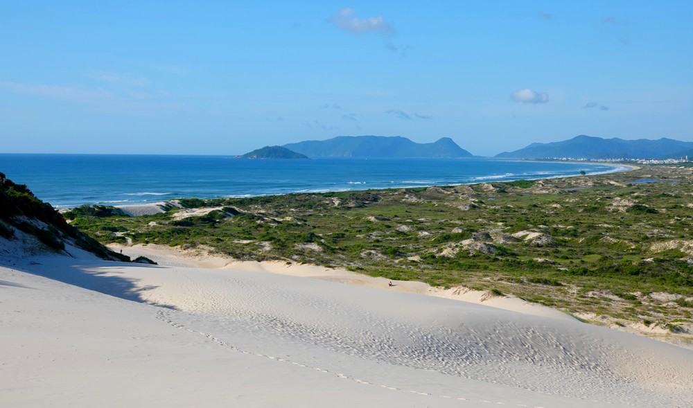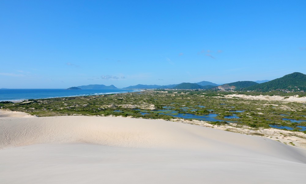 Le paysage est splendide : d’un côté, il s’ouvre sur l’océan atlantique et la grande plage de Joaquina, et de l’autre, on aperçoit les montagnes qui plongent dans le lac da Conceição où nous étions hier. Au pied des dunes, on remarque également une surprenante zone humide…