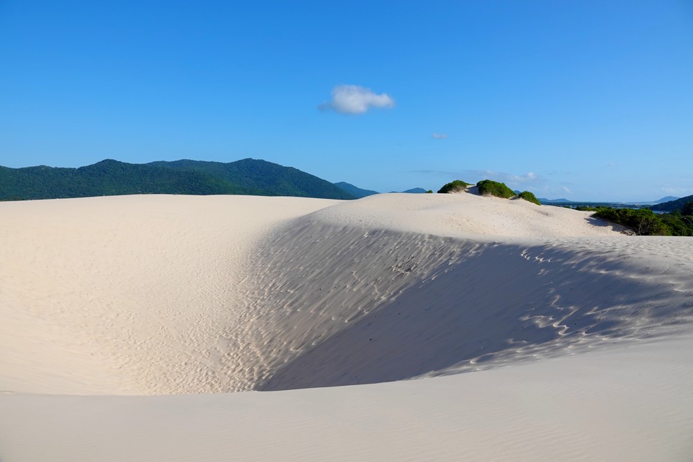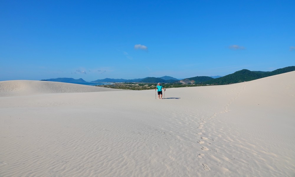 Toujours aussi matinaux, nous partons vers 7h découvrir les dunes de Joaquina, situées au sud du Lagoa da Conceição. Pendant presque une heure, nous nous baladons, les pieds enfoncés dans un sable incroyablement fin et blanc !