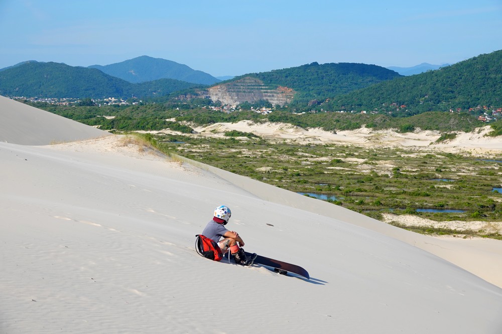 - Balade à pied sur les dunes de Joaquina, accès le plus facile au niveau de la route de la plage de Joaquina (parkings privés ou a priori accès en bus possible). Prévoir une heure sur place voire moins pour ceux qui ne veulent pas marcher. Location de surf possible. En contrebas, plage de Joaquina (parking, R$6 de l’heure), belle plage peu propice à la baignade, beaucoup de surfeurs. Jolis rochers sur la gauche. Restaurants, bars.